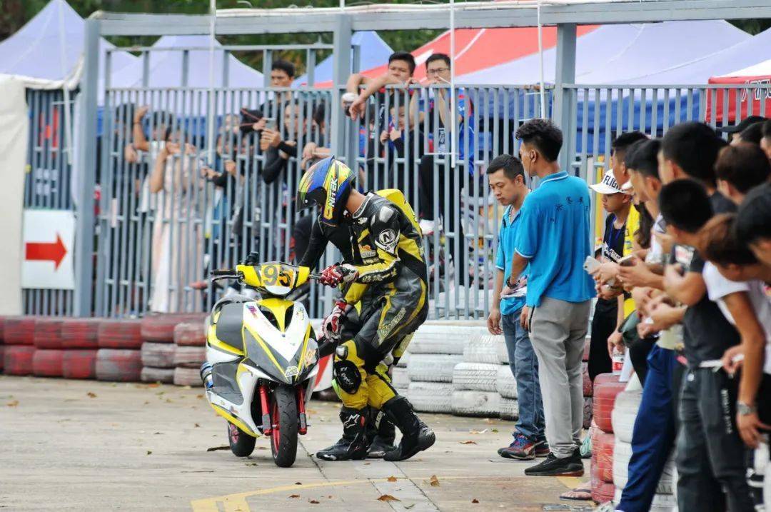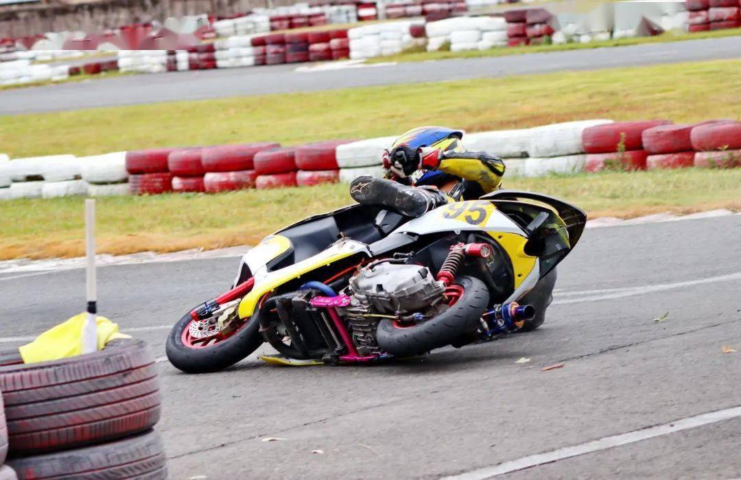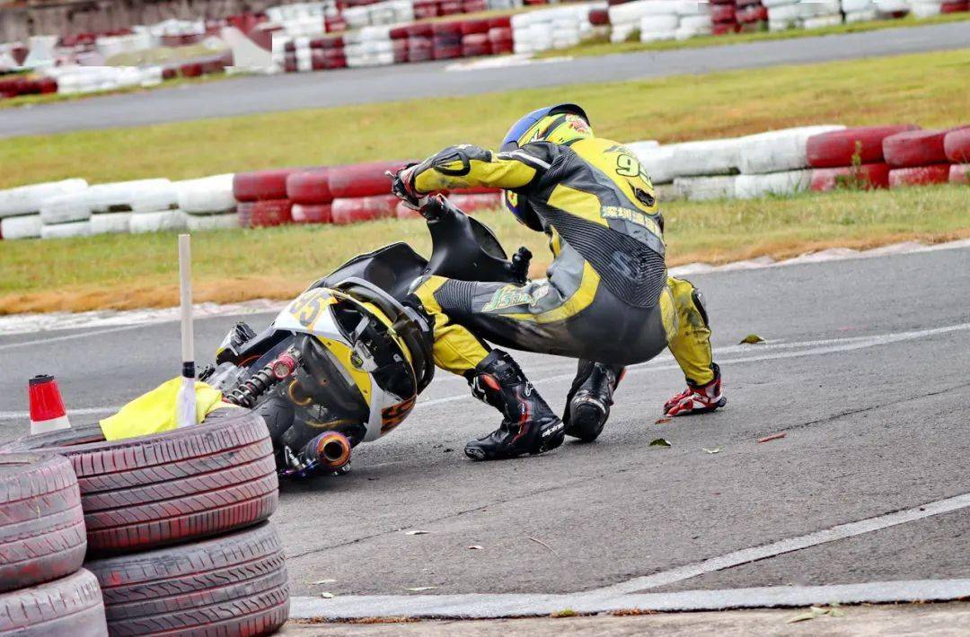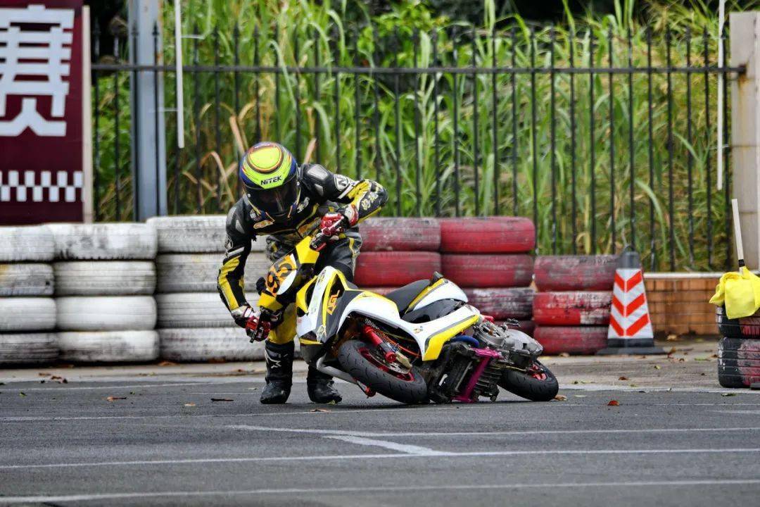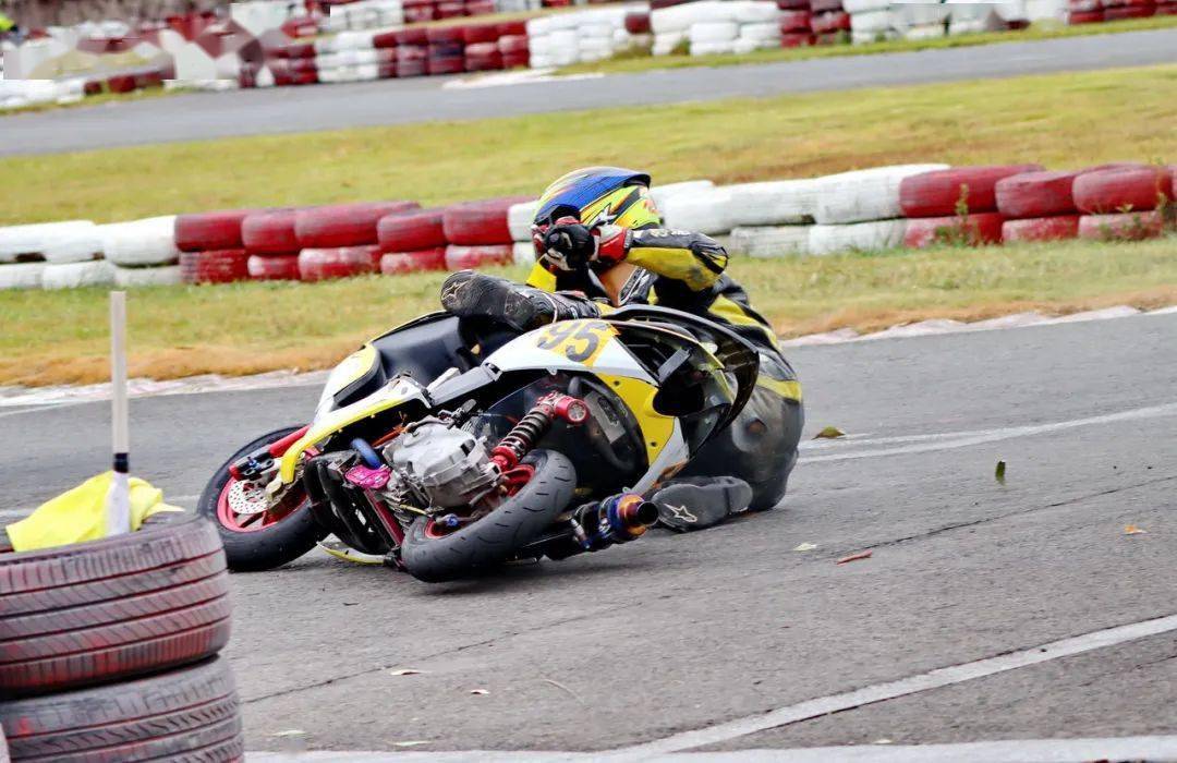 下面的圖片,艾瑞森輪胎改裝踏板 150 cc 公開組、決賽 1(第一節(jié)比賽),駕駛 95 號車的倪天在第 2 圈的最后一個(gè)彎道摔倒。他很快就扶起賽車、并重返賽道。但到了第 9 圈,他因?yàn)橘愜嚬收隙崆巴顺隽吮荣悺?/span>