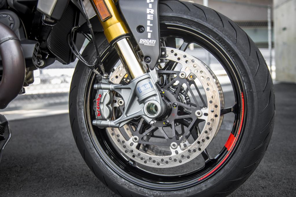 OHLINS倒立式前叉的內(nèi)管直徑為48mm,支持多項調(diào)節(jié)功能,制動器是Brembo M50整體式卡鉗,搭配330mm的雙浮動盤。