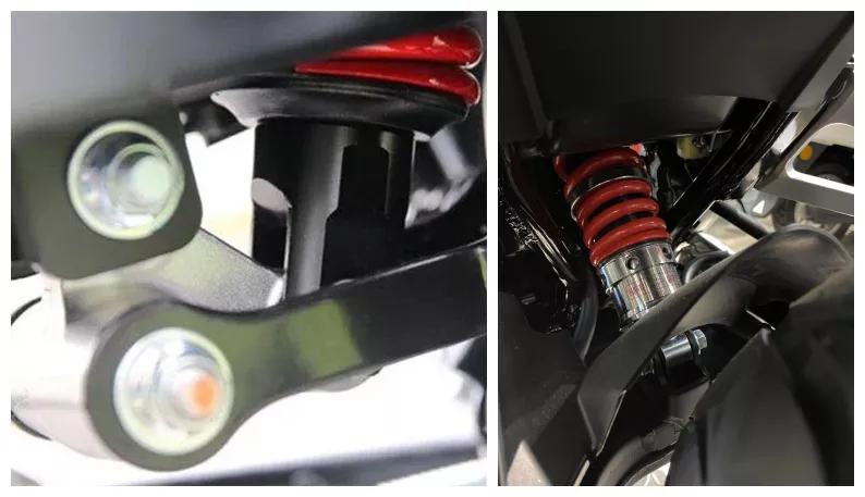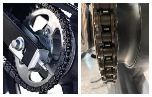 鏈條作為車(chē)子的轉(zhuǎn)動(dòng)機(jī)構(gòu),重要性不言而喻,新款RX1S采用了主流大排量摩托車(chē)相同結(jié)構(gòu)的油封鏈條,潤(rùn)滑更持久,鏈條的保養(yǎng)周期更長(zhǎng),同時(shí)使用壽命也是傳統(tǒng)鏈條的數(shù)倍,廠家宣稱(chēng)鏈條使用壽命長(zhǎng)達(dá)3-5萬(wàn)公里。右側(cè)猛鷙190X使用的則是農(nóng)村代步125一樣的常規(guī)鏈條,沒(méi)有油封結(jié)構(gòu),較為簡(jiǎn)單鏈條重量輕成本低,需要經(jīng)常保養(yǎng),否則使用壽命大打折扣。