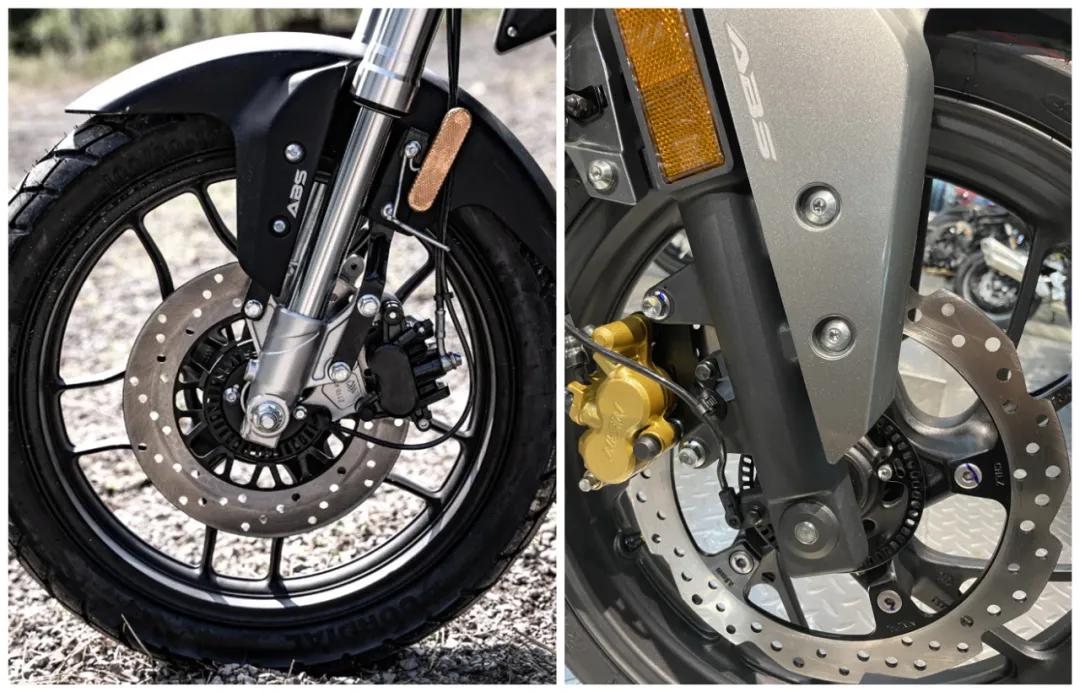 剎車(chē)兩車(chē)配置都一樣,前后碟剎前單碟雙活塞卡鉗,后單碟單活塞卡鉗,但是猛鷙190X國(guó)四版本只上了前輪單通道ABS,雖然前輪抱死是最致命的,但是由于制動(dòng)重心前移,后輪是最容易出現(xiàn)抱死側(cè)滑的情況。這一點(diǎn)賽科龍RX1S又勝一籌,前后雙通道ABS遇到緊急狀況,前后剎車(chē)離合一把抓/踩到底,毫無(wú)顧慮。