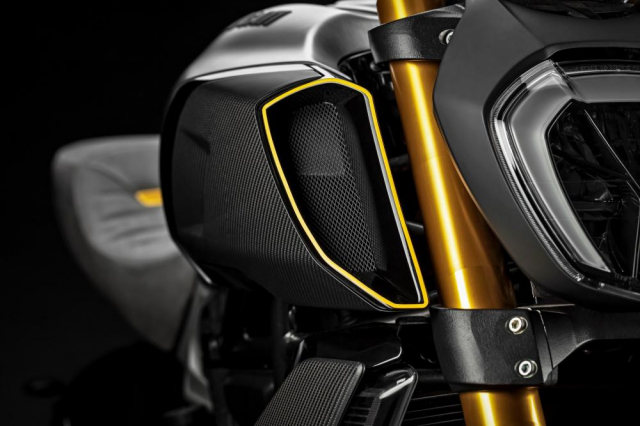 與常規(guī)的Diavel 1260版本相比,Diavel 1260蘭博基尼版,有更多的碳纖維細(xì)節(jié)和獨(dú)特的黃色(與蘭博基尼品牌顏色有關(guān))結(jié)合,視覺上脫穎而出,黃色點(diǎn)綴出現(xiàn)在諸如尾部下方,進(jìn)氣口邊緣,以及坐墊上的徽標(biāo)“ Diavel” 。
