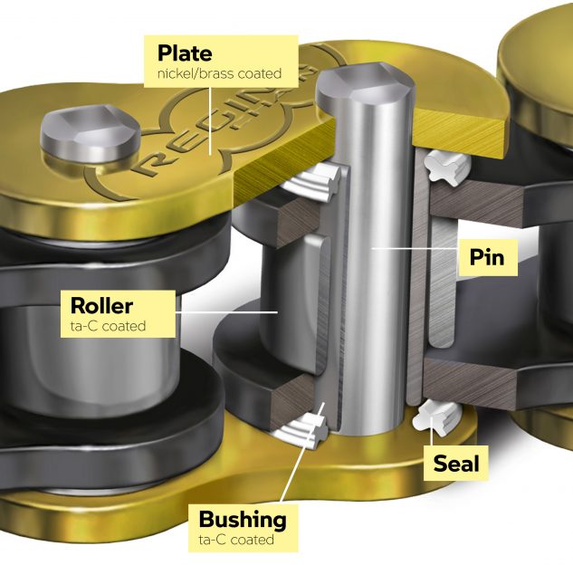 乍看之下,M Endurance是典型的X形環(huán)設計,在滾子和銷之間填充了永久性潤滑劑,寶馬說,這個秘密是在輥子和襯套上一種稱為四面體非晶碳(ta-C)的新涂層材料,一種工業(yè)金剛石。我們熟悉鉆石狀碳(DLC)涂層,該涂層用于減少諸如叉管或發(fā)動機內部零件等零件中的摩擦,這些零件得益于增加的硬度和減小的摩擦。Ta-C是寶馬聲稱的一種特別有效的形式,其性能介于典型DLC涂層和純金剛石之間。據寶馬稱,ta-C涂層不會磨損金屬表面,同時具有低摩擦系數。