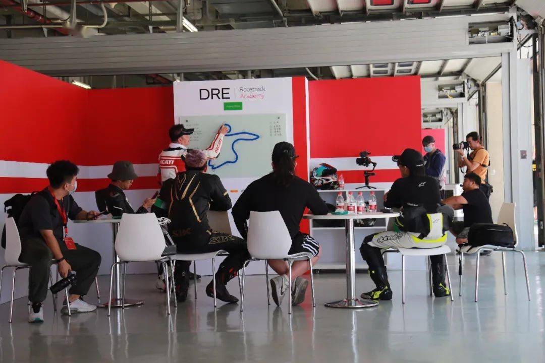 發(fā)布會(huì)后,杜卡迪DRE賽道培訓(xùn)就是用這款全新發(fā)布的Panigale V2,學(xué)習(xí)賽道技術(shù)的同時(shí)也能“白嫖”新車,真是一舉兩得。雖然價(jià)格香,但這款車好不好還是要騎過才知道。一天的DRE課程有四節(jié)賽道練習(xí),學(xué)員被分為6個(gè)組,每組有專門的教練,這次教練團(tuán)隊(duì)相比去年少了很多外教,可能是因?yàn)橐咔樵?,但好處就是溝通起來很方便。每?jié)練習(xí)之后,教練都會(huì)指出學(xué)員的問題并進(jìn)行解答,DRE賽道培訓(xùn)基本都是這套流程,教練組非常認(rèn)真負(fù)責(zé),完備的后勤保障也能讓學(xué)員安心練習(xí)。