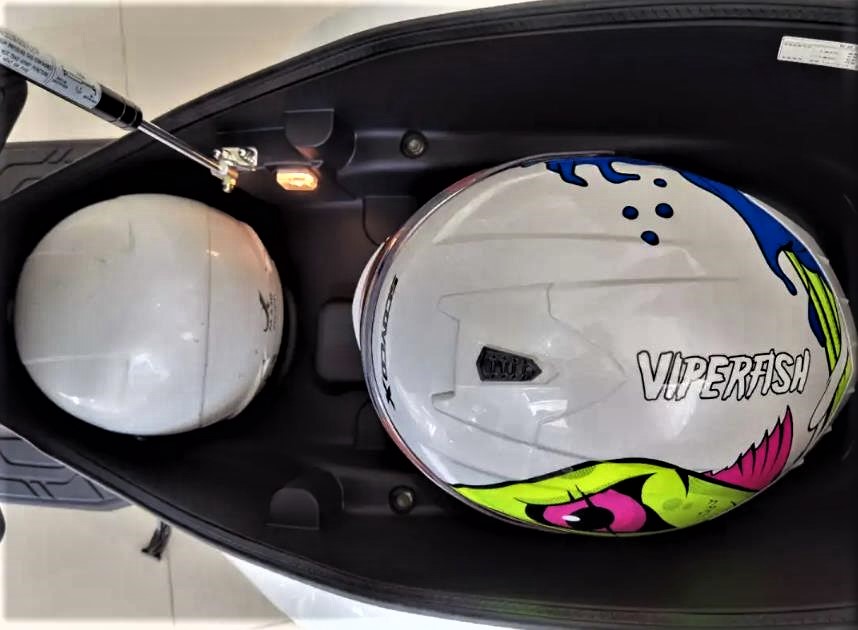 座桶儲物空間非常大,在放置兩頂全盔的情況下,還余下不少的空間,可以放置手套等一些小物件,在不裝尾箱的情況下解決兩人的短途出行問題。此外,座桶內(nèi)還有鹵素照明燈,以及液壓撐桿。