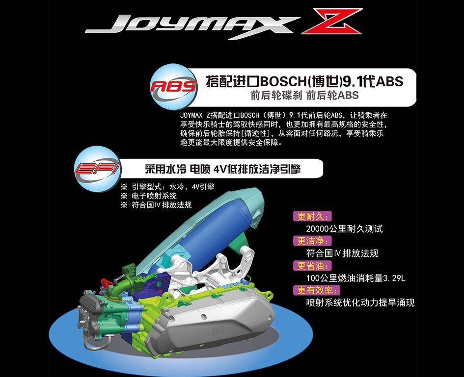 與老款車型相同,采用278cc排量的水冷四氣門電噴發(fā)動機(jī),最大功率18kW/8000rpm,最大扭矩24N.m/6500rpm,三陽宣稱百公里燃油消耗量3.29L,12L的大油箱能夠帶來350公里左右的續(xù)航水平。