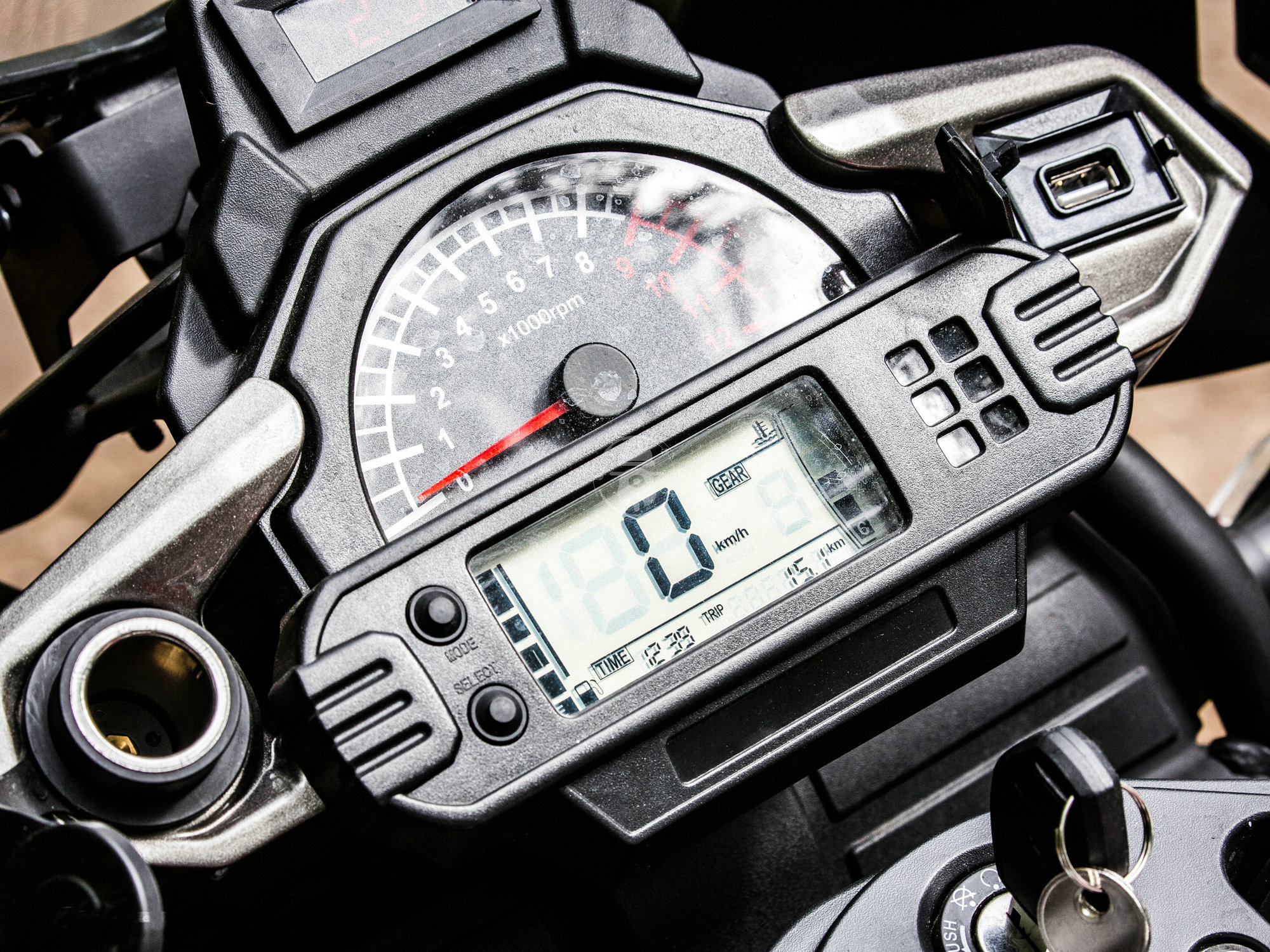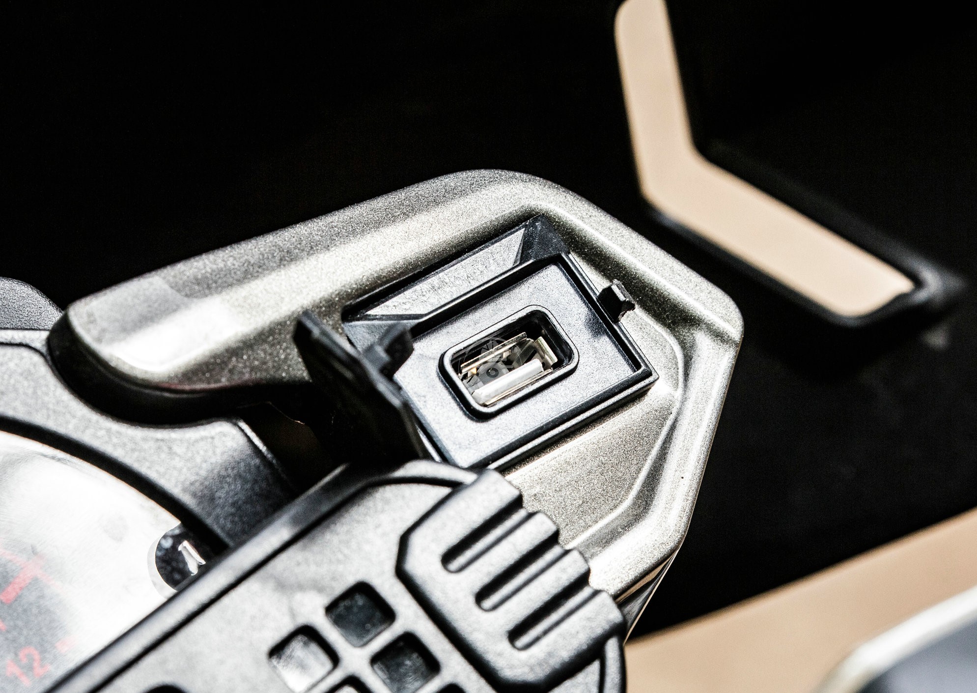 也并不是說這個(gè)儀表完全一無是處,至少充電接口的設(shè)計(jì)十分方便,左側(cè)有個(gè)點(diǎn)煙器接口,右側(cè)有個(gè)USB接口,都有防水蓋的設(shè)計(jì),手機(jī)什么的充電十分方便。