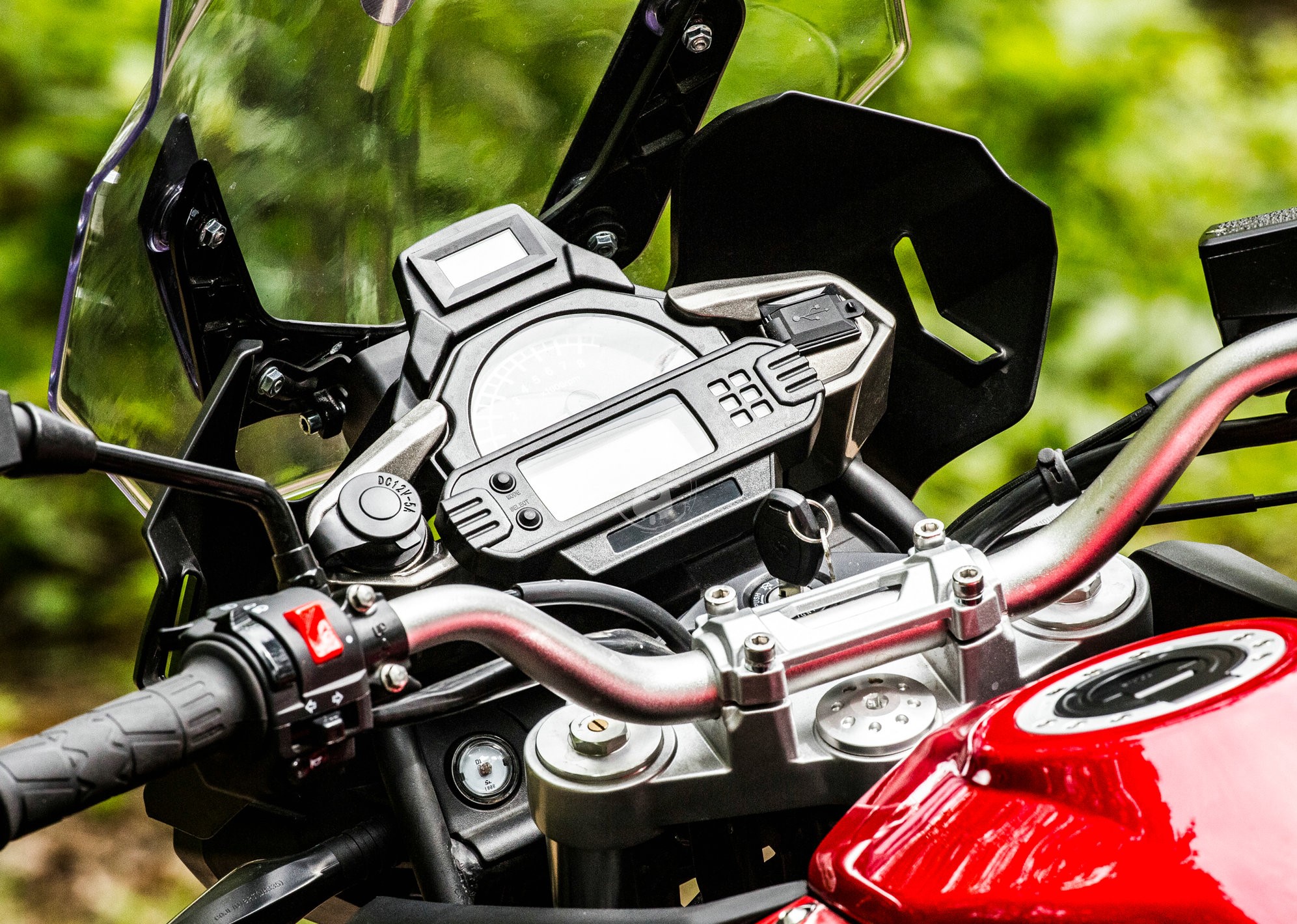 倒立式前減震具備調(diào)節(jié)的功能,而且在儀表盤下方有一個(gè)小小的指南針,這個(gè)雖然不是很起眼,但是作用相當(dāng)大,賽科龍不愧是經(jīng)常參加拉力賽的???,這一點(diǎn)值得點(diǎn)贊。