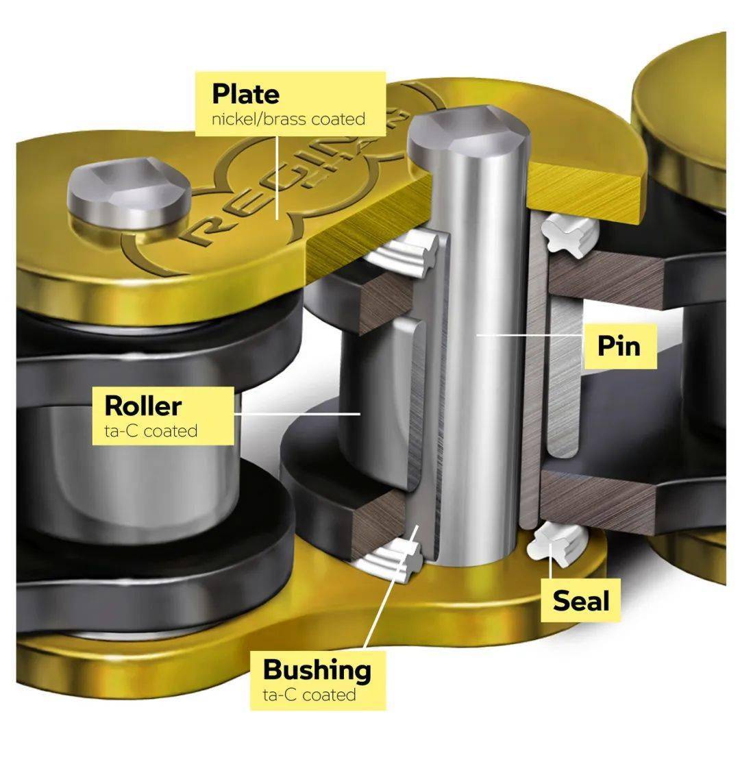 由 Regina 代工生產(chǎn)的 M Endurance 傳動(dòng)鏈條,采用了 Regina 自主的 X-Ring 墊圈設(shè)計(jì)(每節(jié)鏈條的軸銷(xiāo)處、都有一個(gè) X 型切面的墊圈),墊圈的內(nèi)部作了一個(gè)永久性的潤(rùn)滑劑填充,使用過(guò)程中毋須額外的潤(rùn)滑劑,因此不再需要像過(guò)往那樣、使用熟悉的 “ 鏈條潤(rùn)滑 ”,同時(shí)也不再需要由于日常使用中的磨損所導(dǎo)致的、不時(shí)地對(duì)鏈條作新的張緊調(diào)整。