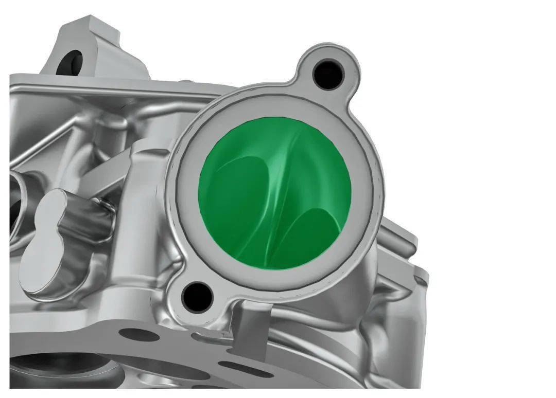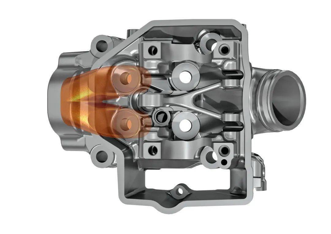 排汽管采用了全新的布局與設(shè)計,之前第五代所使用的是二出一出二、重量為 5.08 公斤的設(shè)計,而新的排汽系統(tǒng)重量只有 3.84 公斤、降低了 1.24 公斤,采用了單出的設(shè)計。對應(yīng)配汽系統(tǒng)、排汽閥的新設(shè)計,排汽管前端采用橢圓的形狀、且與排汽閥呈垂直對接的角度。
