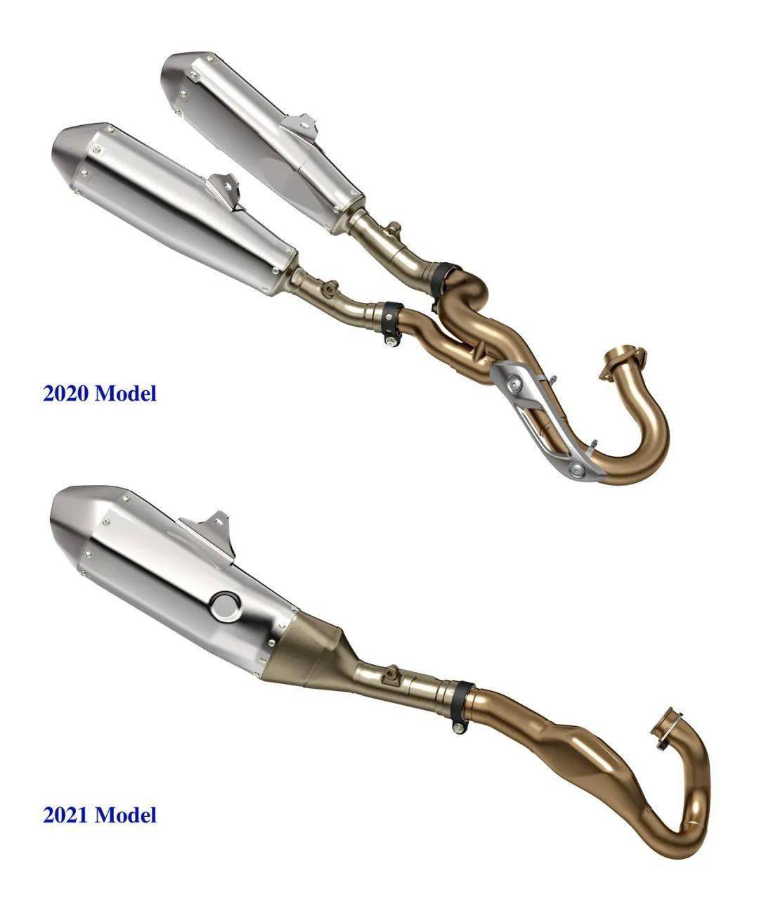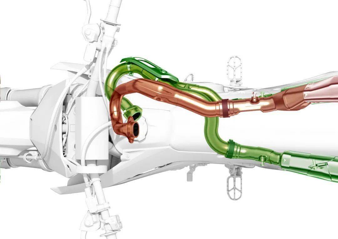 新排汽管的前段、口徑為 74 mm,采用了更靠近車體中心線的布局,以改善騎乘時的人體工程學(xué)設(shè)計。整個排汽系統(tǒng)采用了雙回壓的設(shè)計,降低噪音的同時也提升了中、低轉(zhuǎn)速域的扭力。