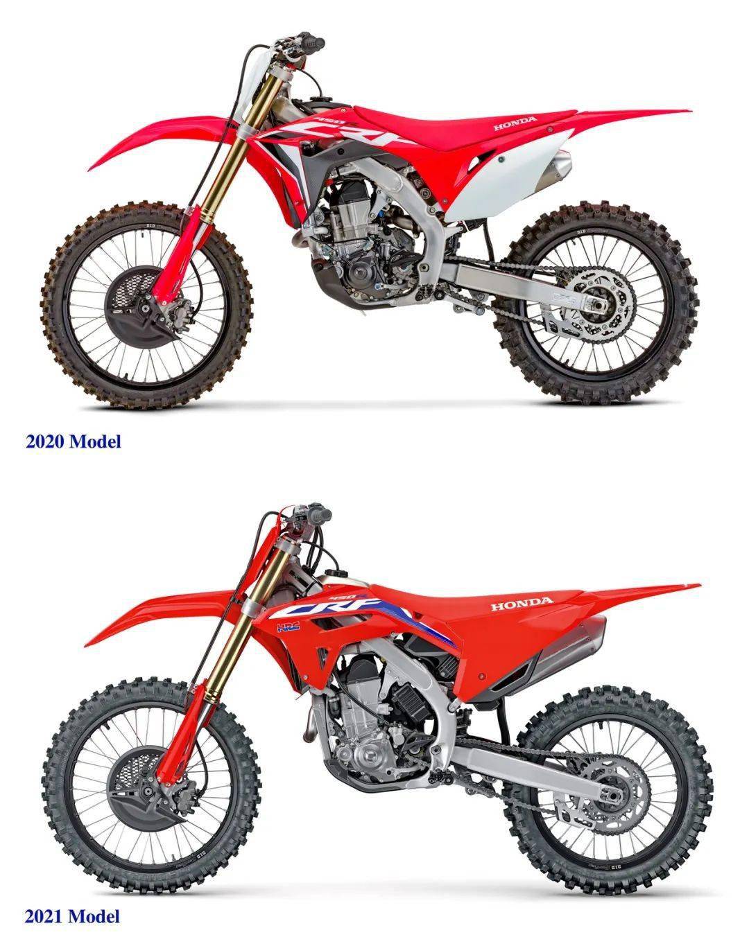 下面的圖片,現(xiàn)行款的 2020' CRF450R(車尾兩側(cè)張貼號碼的位置上、采用了白色的第五代)與新一代的 2021' CRF450R。