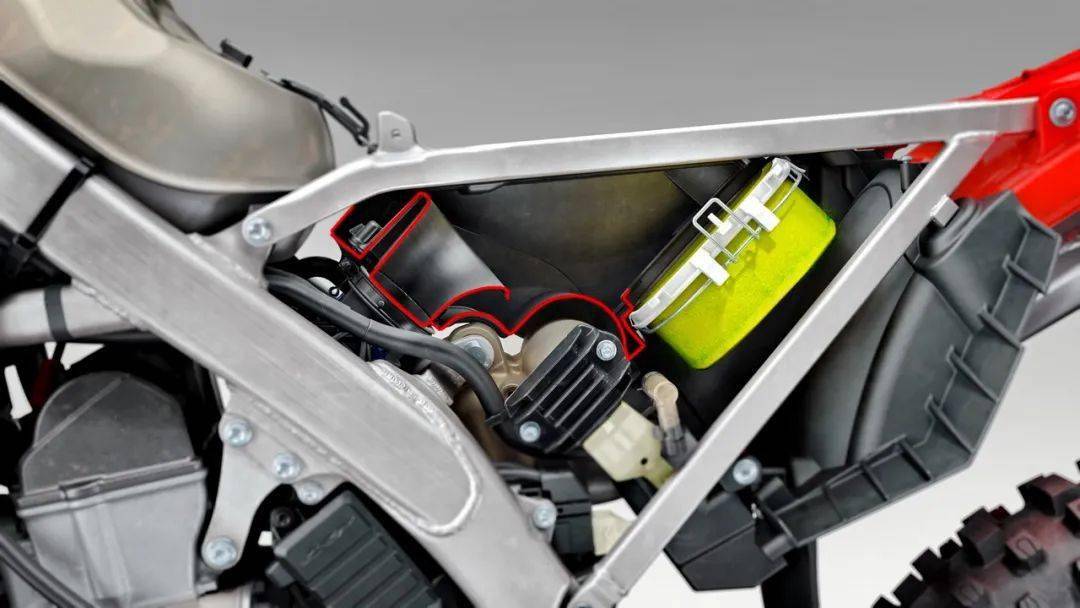 內(nèi)部細(xì)節(jié)的變化,與第五代 CRF450R 相比,新一代車型動力單元的最大變化是對配系結(jié)構(gòu)的修改:新設(shè)計的、配重部分轉(zhuǎn)到凸輪軸另一端的減壓系統(tǒng),新設(shè)計在低轉(zhuǎn)速下提供更穩(wěn)定的操作,同時可增加了失速時的阻力;為了提高排汽效率,排汽閥與排汽管之間的通道采用了一個更為平直的出汽設(shè)計,而排汽閥的出口形狀、采用了與超級跑車 CBR1000RR-R 相同的橢圓形設(shè)計,而不是現(xiàn)行第五代 CRF450R 的圓形設(shè)計;而電噴系統(tǒng)中的噴油咀角度也從第五代的 30° 修改為新的 60° 以提高進氣效率,新設(shè)計改變了燃料與新鮮空氣的流動方向,冷卻了混合氣體,并能為車手提供至關(guān)重要的節(jié)氣門感覺;汽油泵采用了一個更細(xì)的設(shè)計,新款使用四個螺栓作固定、而不是第五代車型的六個,重量上降低了 120 克,且有著與先前設(shè)計相同的壓力和過濾器壽命。