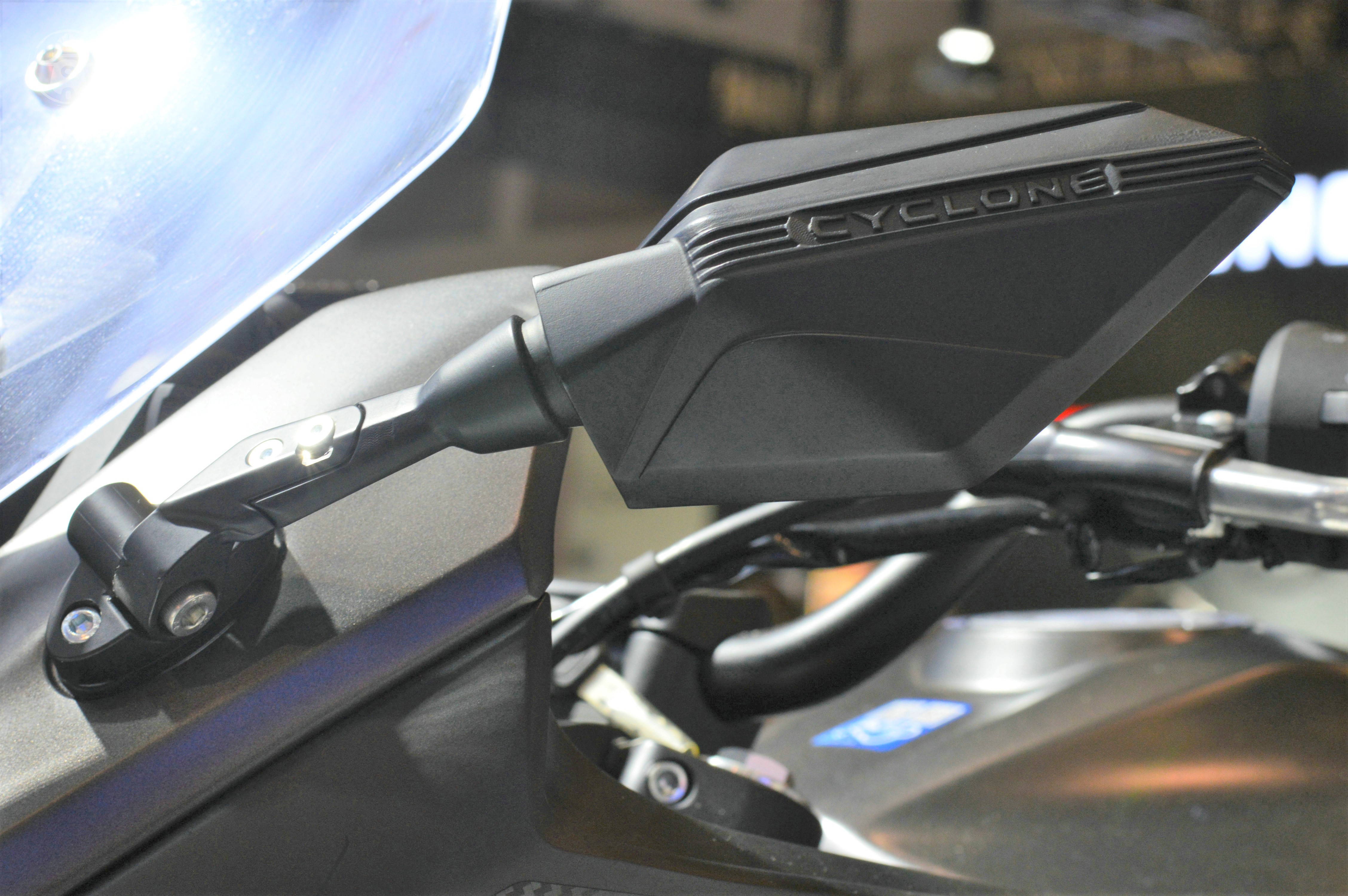 儀表盤是大尺寸全液晶的顯示屏,雖然沒有點亮但是可以預測到應該是全彩TFT的形式,此外儀表盤旁邊可以看到調(diào)節(jié)風擋的旋鈕。另一個值得注意的就是,車把按鍵并不是之前常見的通用件,這對質(zhì)感的提升有非常大的作用。