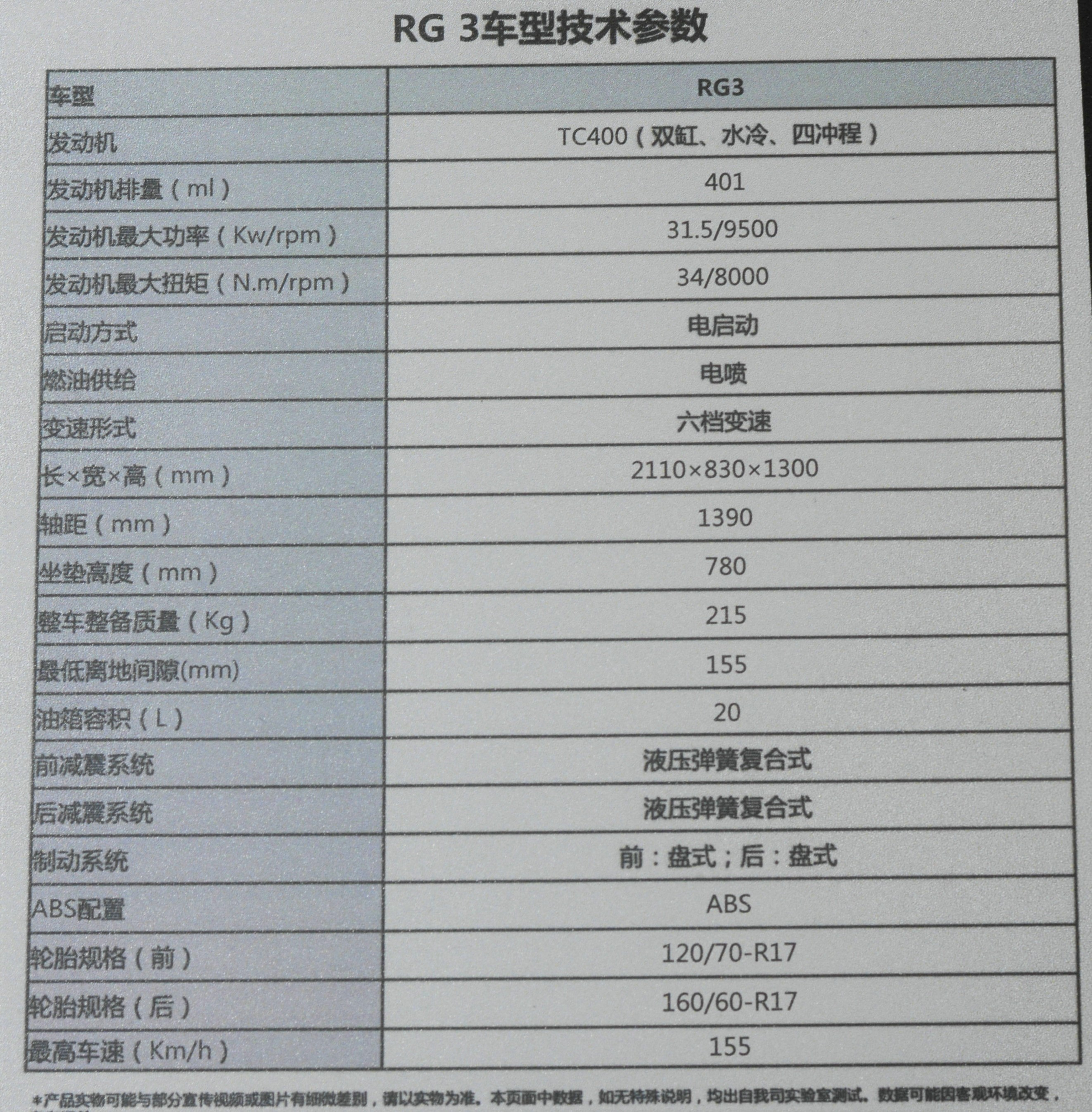 賽科龍RG3搭載一款,實際排量401CC的,雙缸水冷四沖程發(fā)動機,最大功率31.5kw/9500rpm,最大扭矩34Nm/8000rpm;比T宗申著名的C380發(fā)動機輸出數(shù)據(jù)略有提升,整體數(shù)據(jù)表現(xiàn)處于國產(chǎn)前三的水平。
