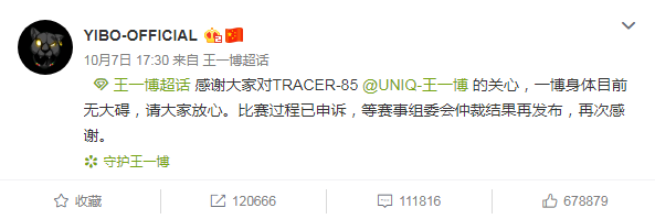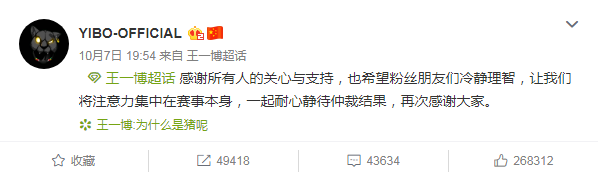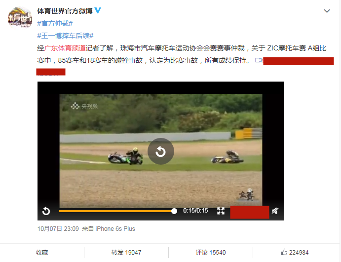 10月7日,王一博參加ZIC摩托車賽A組比賽時,和失誤的選手發(fā)生碰撞,碰撞后王一博連人帶車摔倒在地,起身后無法發(fā)動車輛,只能被迫放棄比賽,之后王一博提出申訴。