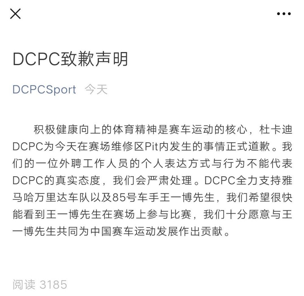 胡通明所在的車隊也發(fā)聲明向王一博致歉,車隊表示在賽場維修區(qū)歡呼的是一位外聘工作人員,車隊將對他進行嚴肅處理。