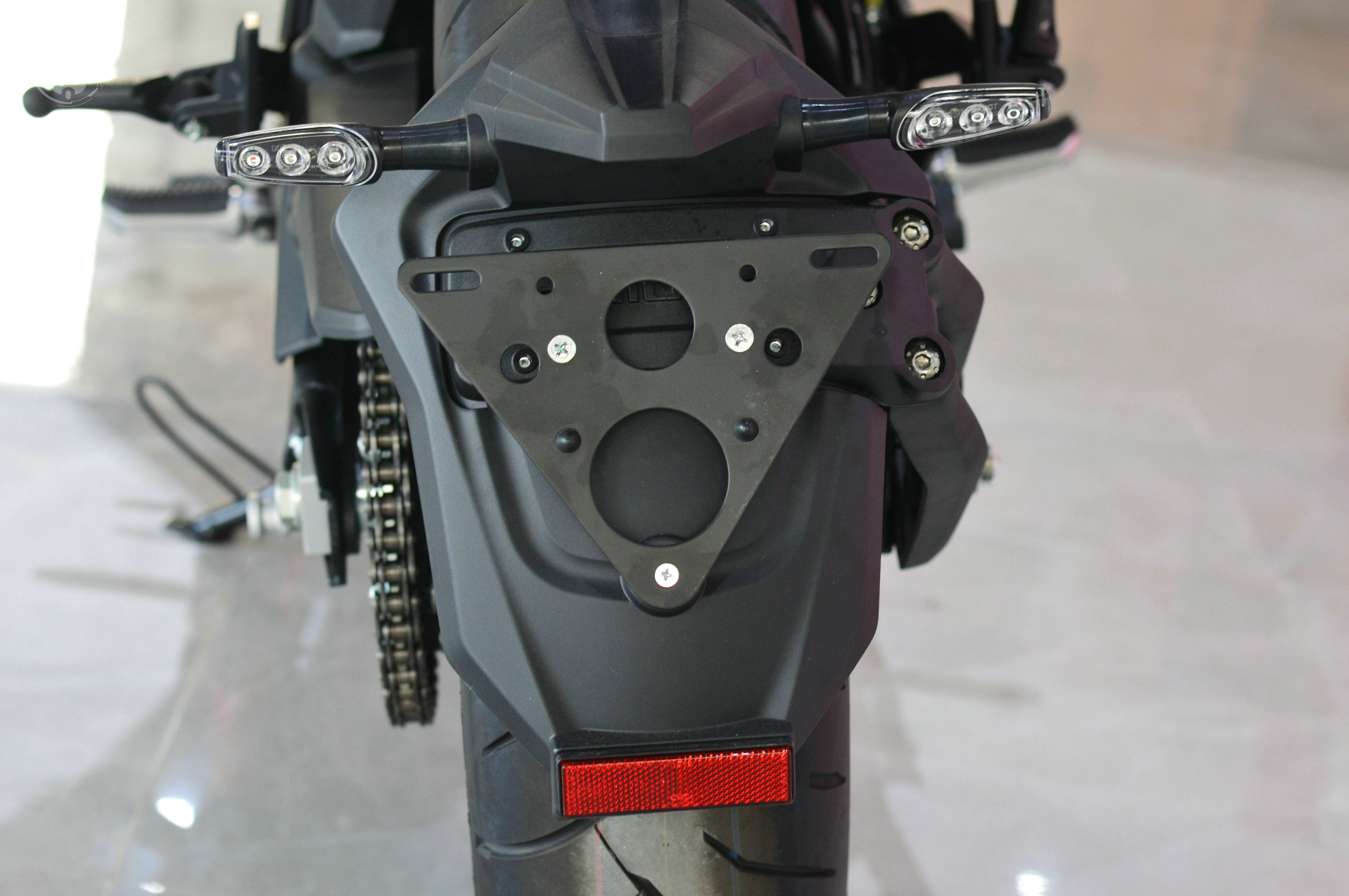 后轉(zhuǎn)向燈集成在牌照框上,是廠家在實(shí)用性和美觀之間有所取舍的結(jié)果,但是擋泥板的效果確實(shí)也還不錯(cuò)。