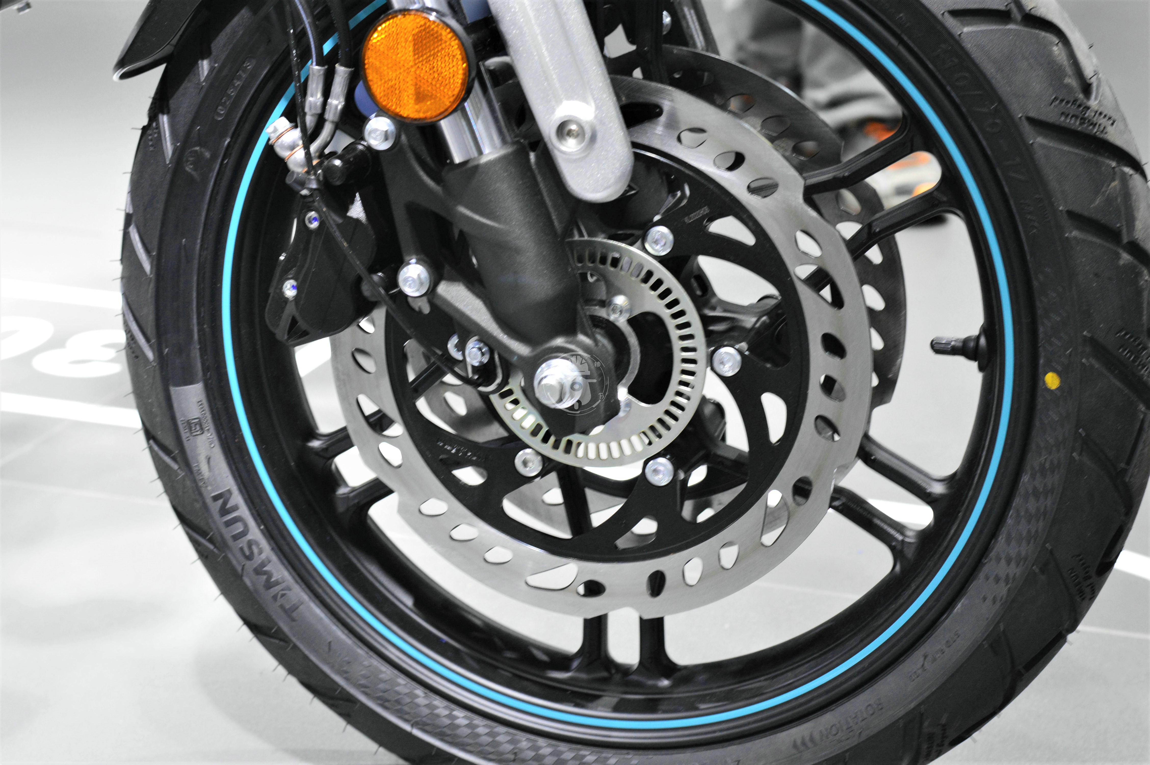 前300mm雙盤,后220mm單盤,標(biāo)配雙通道ABS防抱死系統(tǒng),搭配騰森TS-659A輪胎。