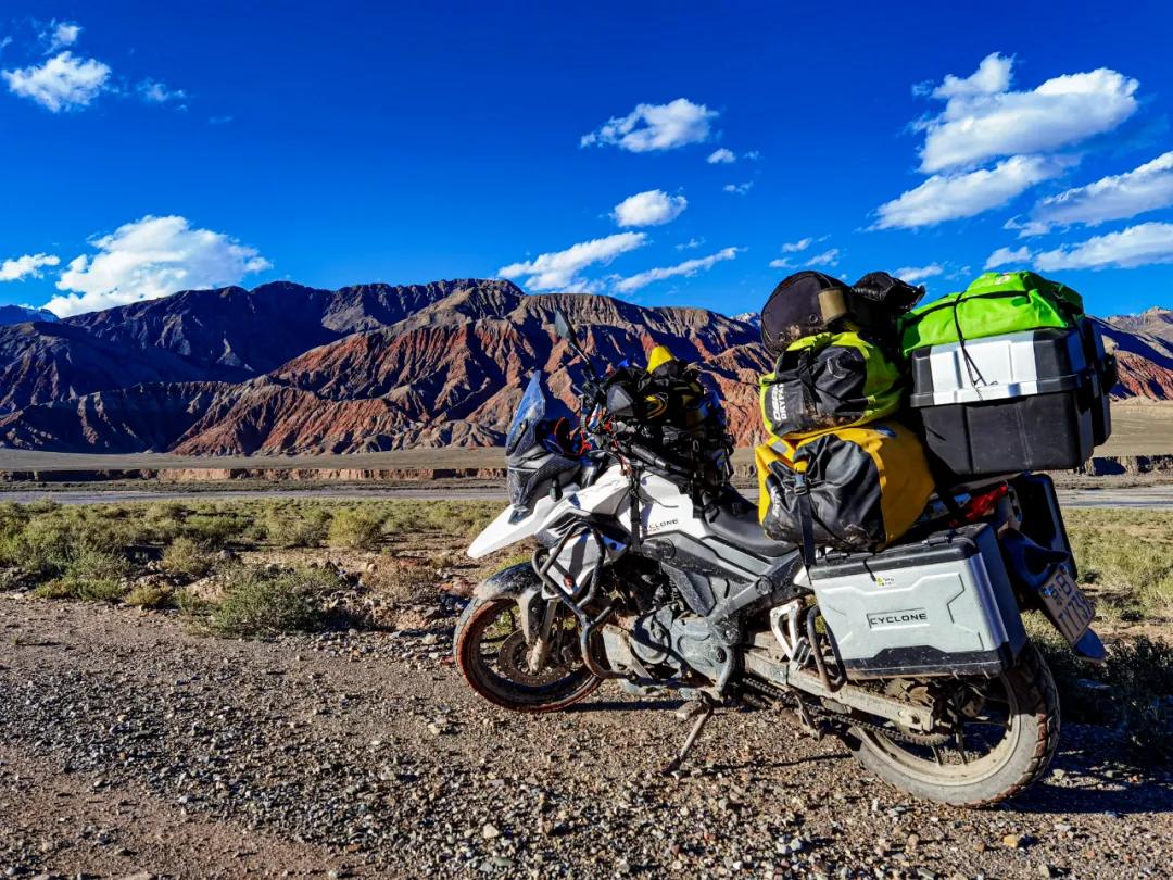 下到坡底,進(jìn)入疏勒河谷溝口,這一小段坡度很大,還有小水流,一部分路基被水沖毀,有泥水流帶來(lái)的浮石浮沙,很是松軟。出溝口小下坡時(shí),車轍里有一段紅色的稀泥,雖減慢了速度,但前輪一踏上就呲溜了,沒有摩擦力,后輪扭動(dòng),即刻翻車。帶行李不能扶起,卸下后面三個(gè)行包,用力扶起車子,再裝包,繼續(xù)前進(jìn)。