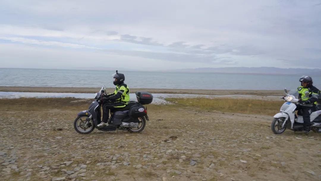 在領(lǐng)騎金童小姐姐與一位當(dāng)?shù)啬撩駵贤ê?,進(jìn)入了青海湖岸邊。騎著提拉米蘇再岸邊的亂石河灘上一通繞行,狠狠地享受了一把在青海湖邊騎行的樂趣。