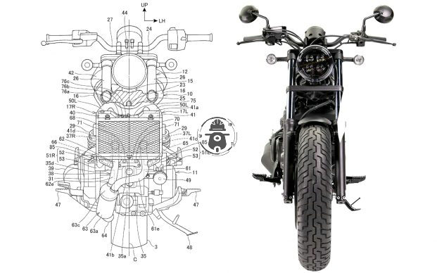 最新的專利上,帶有DCT版本的Africa Twin發(fā)動機(jī)的Rebel右側(cè)和正面看起來都很漂亮,Unicam發(fā)動機(jī)蓋與現(xiàn)有Rebel 500和300上使用的DOHC發(fā)動機(jī)不同。前視圖(如下圖所示)顯示了發(fā)動機(jī)和燃油箱,它們明顯比苗條的Rebel 500更寬。