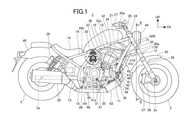 怎么看出這個DCT雙離合器變速箱呢,請注意專利圖中的車把沒有離合器拉桿。排氣傳感器專利描述了探頭(圖中的#65和#66),如何連接到散熱器底部邊緣下方的兩個總管。這使散熱器可以為排氣傳感器提供一點(diǎn)保護(hù),同時還可以方便地接近它們。傳感器還受到框架的保護(hù),免受背部的影響,而排氣管的保護(hù)則低于其下方。