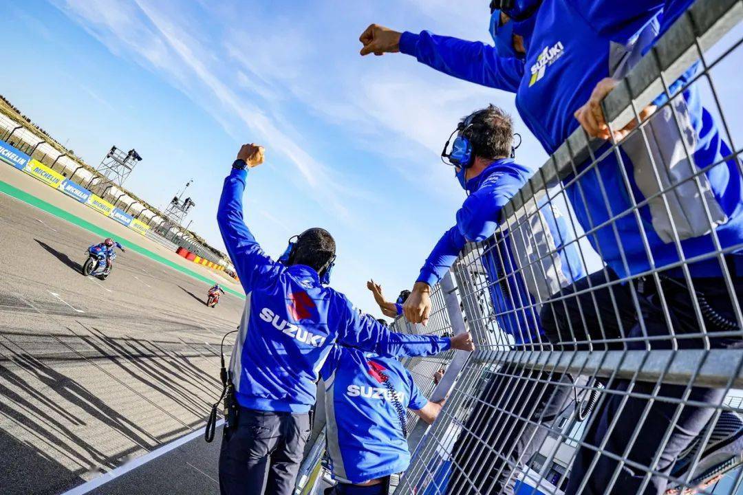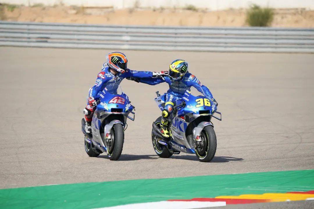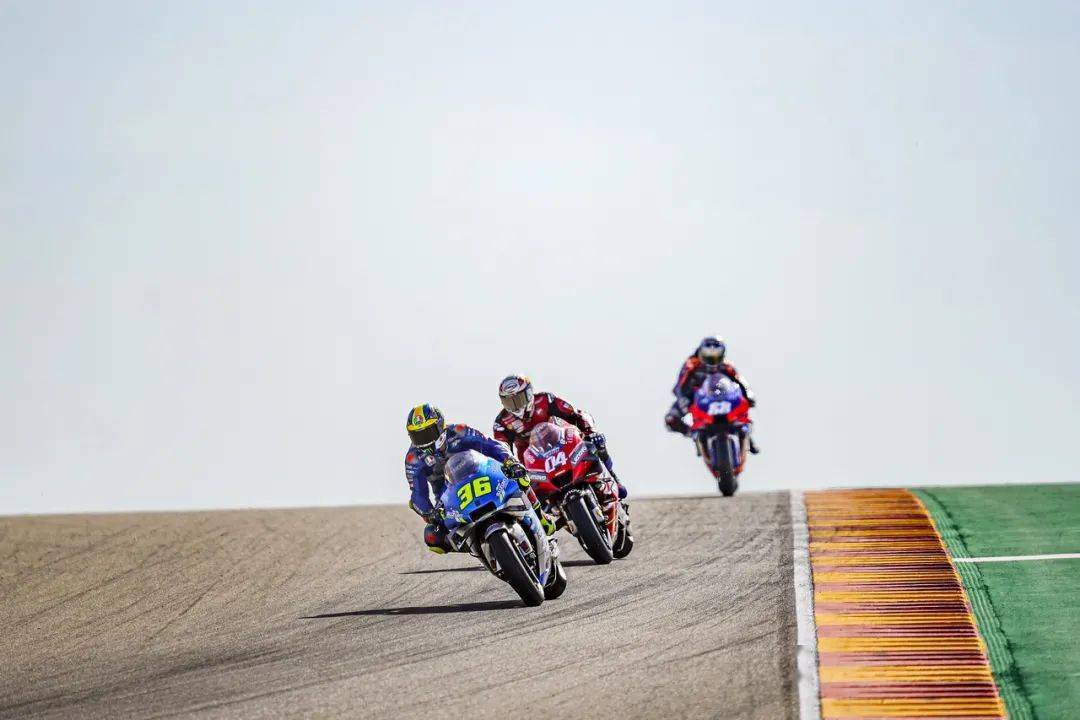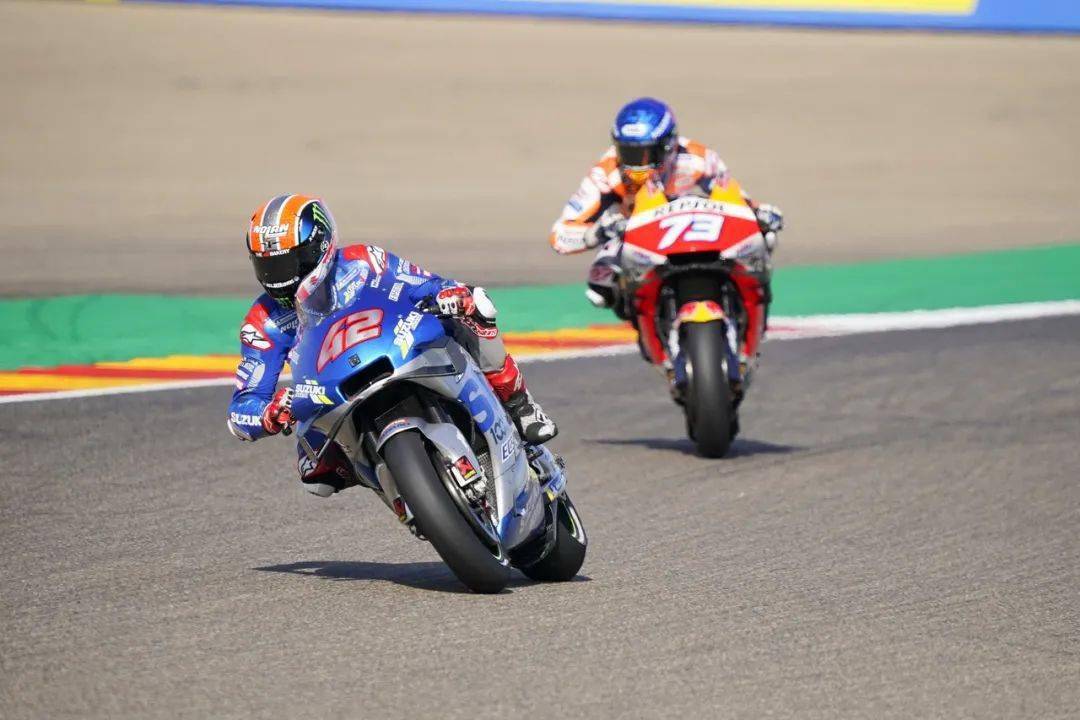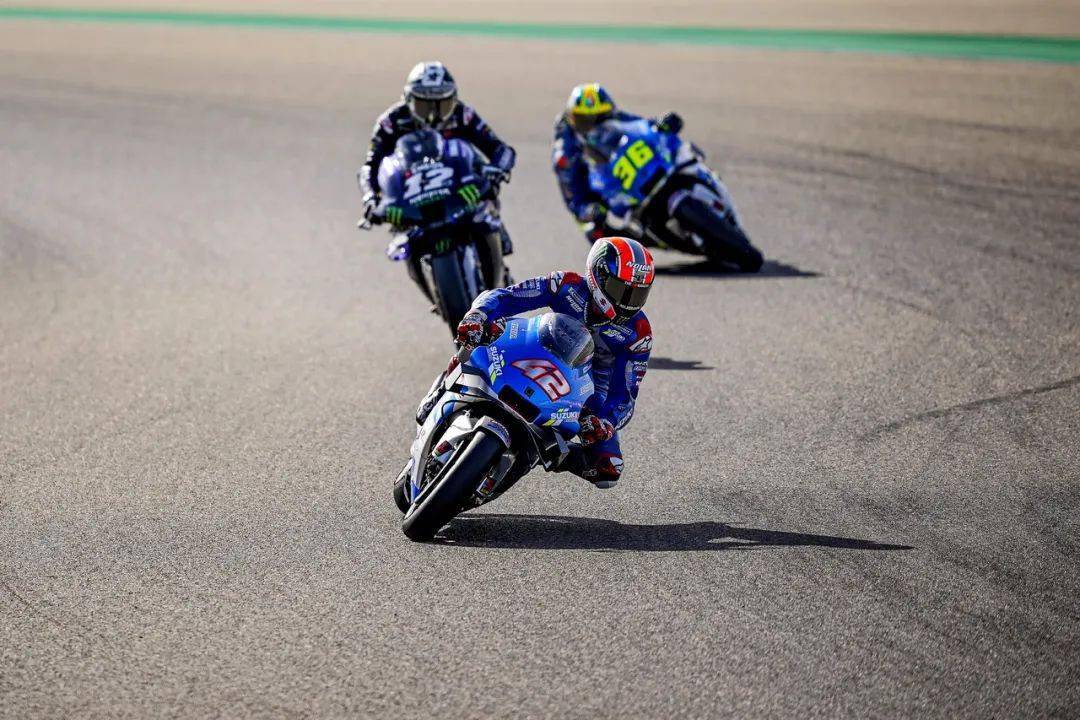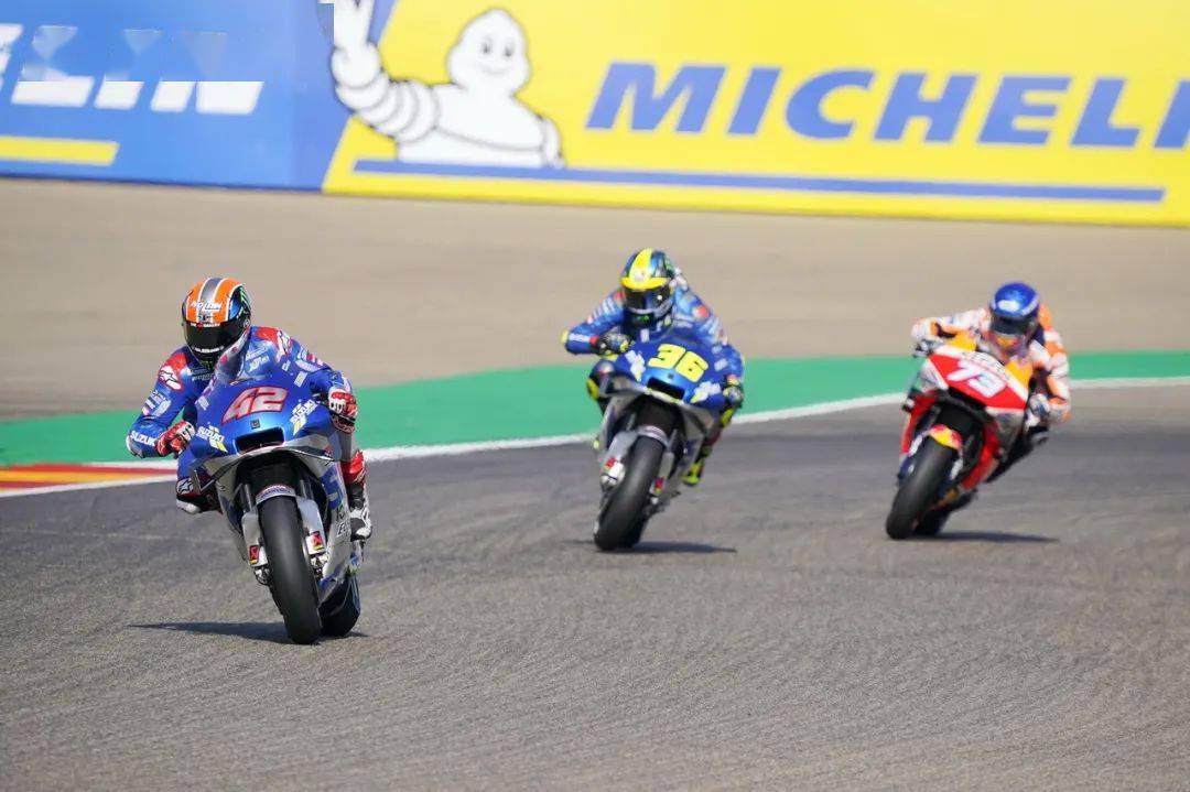 對(duì)手在減速,從起步之處就跟在后面的 Suzuki 兵團(tuán)開(kāi)始動(dòng)手,林斯(Alex Rins)、米爾(Joan Mir)陸續(xù)搶進(jìn)了第一集團(tuán)。