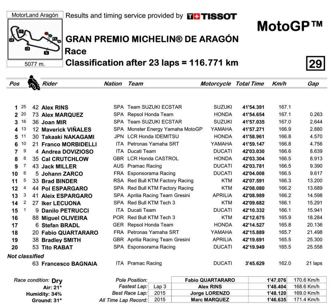 MotoGP 級(jí)別的賽程是 23 圈、折合約 116.771 公里。