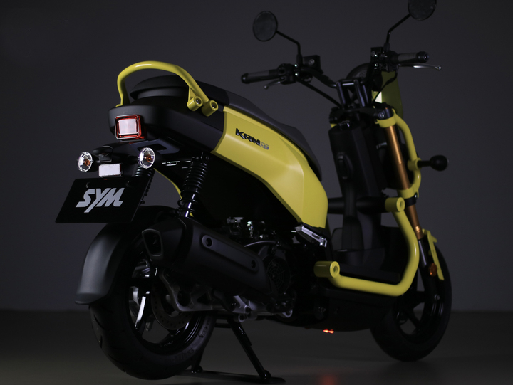 車尾整體設(shè)計(jì)非常方正,后扶手的款式也很新穎,尾燈也是傳統(tǒng)鹵素?zé)襞?,牌照框采用了簍空處理。三陽(yáng)還在這款車上采用了引以為豪的“三零”設(shè)計(jì)。后避震是零后仰懸掛系統(tǒng),另有零噪音零污染怠速熄火系統(tǒng),以及零延遲啟動(dòng)系統(tǒng)。