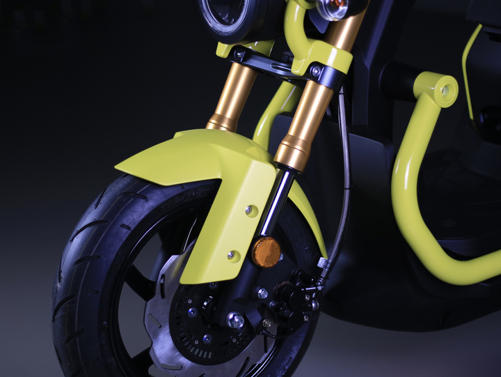 KRN BT采用小踏板上比較少見的倒立式前叉,金色的叉管看起來(lái)很有檔次,前剎車采用單向雙活塞卡鉗配ABS防抱死系統(tǒng),110/70-12的前輪并不算大。