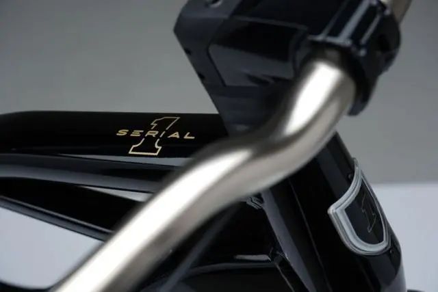 Serial1的誕生是為了致敬1903年哈雷戴維森推出的首款摩托車,整體造型設(shè)計(jì)采用了弧形及流線型元素,看起來相當(dāng)?shù)娜岷?。通體白色的輪胎配上黑色輪轂,形成了強(qiáng)烈對(duì)比。仿皮質(zhì)復(fù)古坐墊像是把人拉回了自行車剛剛開始流行的年代。