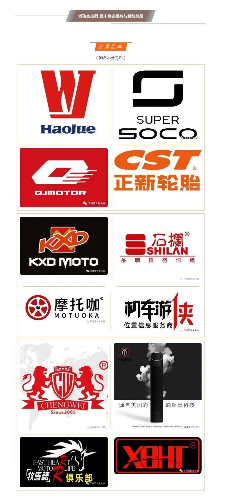 【品牌亮點(diǎn)】年會現(xiàn)場眾多品牌即將亮相,豪爵、QJ MOTO、正新輪胎;熱門的、小眾的、大品牌的、個(gè)性定制的~各種摩托車品牌及周邊產(chǎn)品,琳瑯滿目,不買也能飽眼福,說不定要有現(xiàn)場福利價(jià)哦!想知道還有什么品牌,下拉查看喲!總之,不會讓車友們失望!