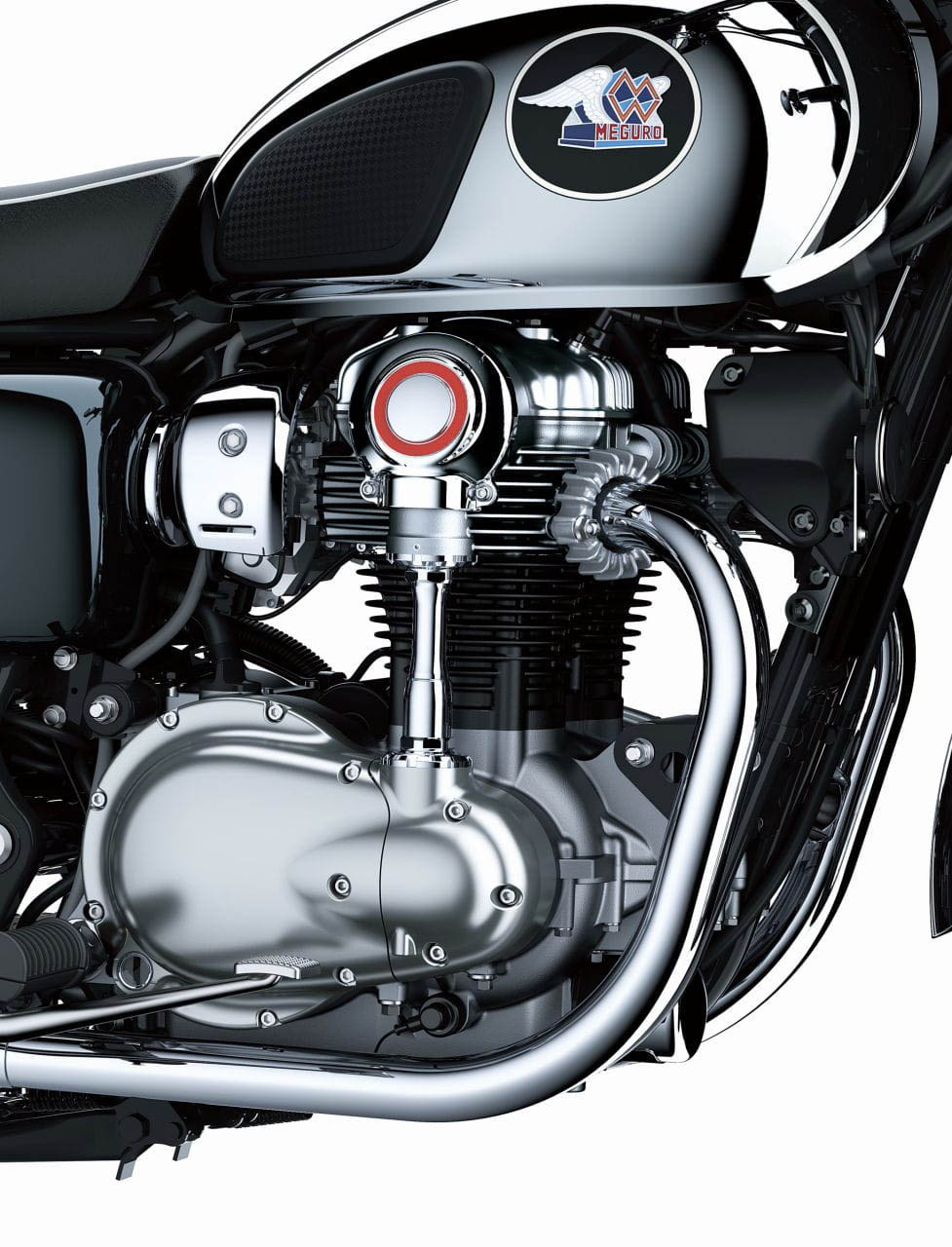 消聲器,節(jié)氣門(mén)體蓋,空氣濾清器進(jìn)氣環(huán),鏈條蓋,油箱蓋,前后轉(zhuǎn)向信號(hào)燈體,尾燈體。此外,制動(dòng)踏板,后視鏡,前大燈輪輞和機(jī)油濾清器蓋均鍍鉻。黑色涂料和鍍鉻之間的良好對(duì)比使Meguro具有獨(dú)特的沉穩(wěn)色彩。輪輞是銀色的鋁合金,速度表面板和側(cè)蓋上刻有“ Meguro”徽標(biāo),而風(fēng)冷立式雙缸發(fā)動(dòng)機(jī)的錐齒輪蓋則刻有紅色,以強(qiáng)調(diào)MEGURO K3的獨(dú)特性。