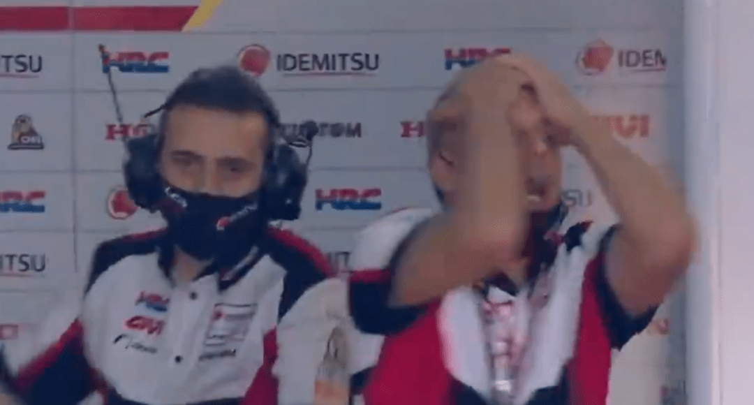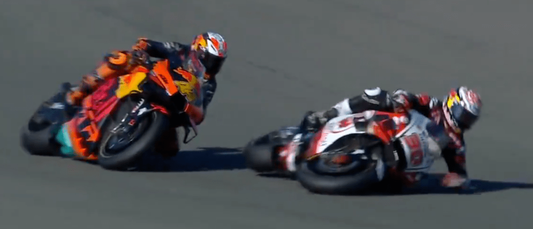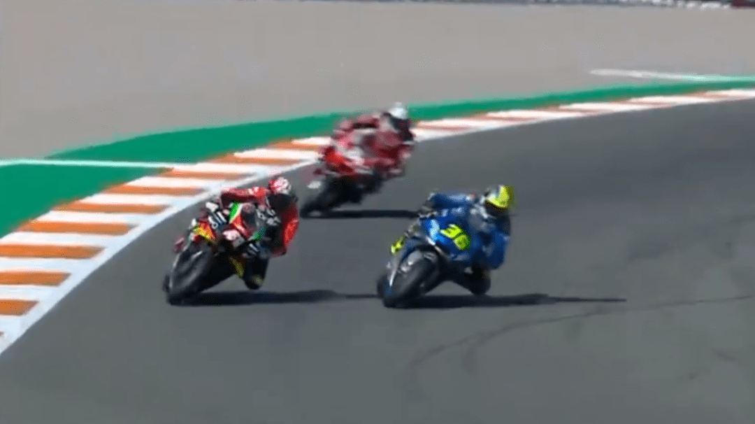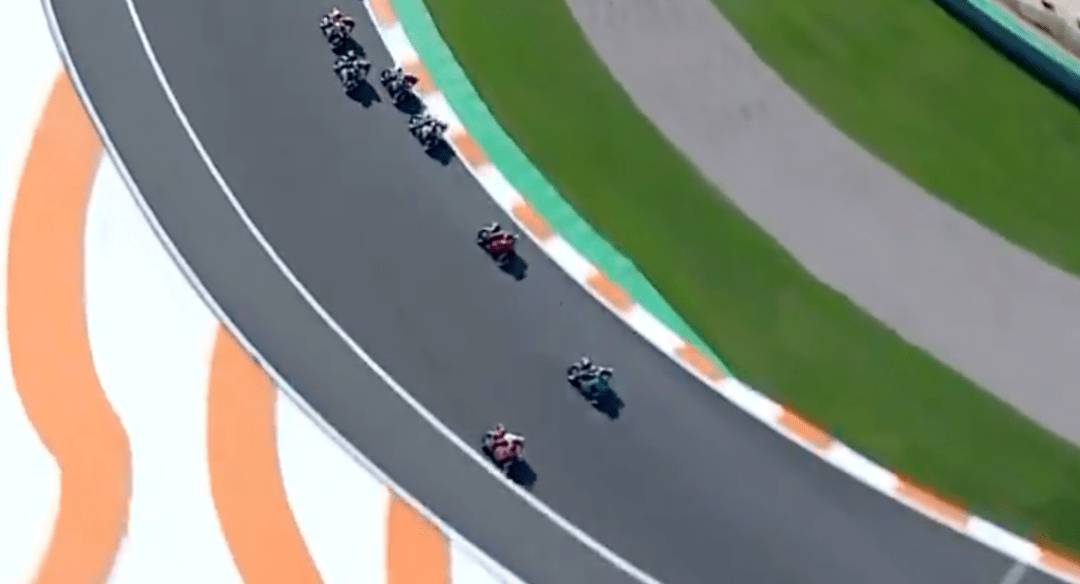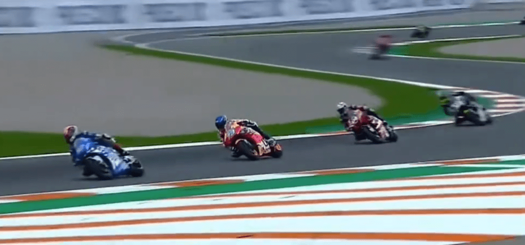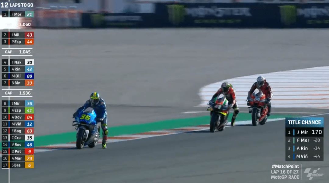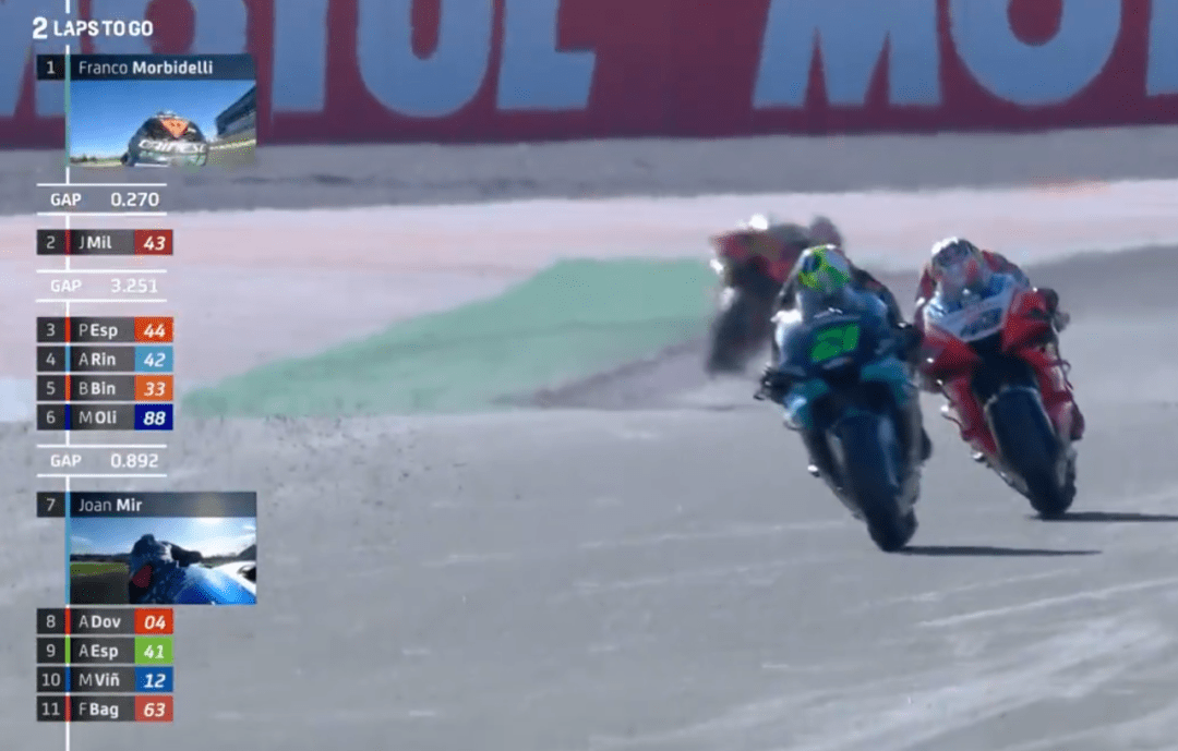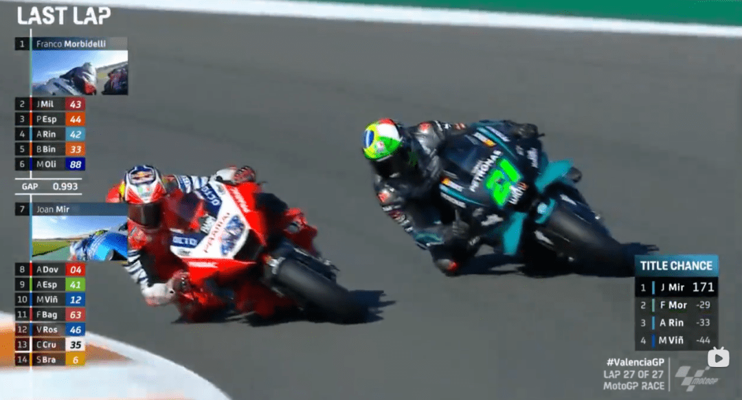 比賽前8圈風(fēng)平浪靜,大家好像都不想打破這種平靜,只有小Q一人在后面努力掙扎著回來。比賽還剩19圈,小Q摔車了,由于在后面拼太狠,剎車直接側(cè)滑出去,摔車后的小Q非常平靜,好像如釋重負(fù),今年的競爭就到這里了,小Q盡力了。而小Q的摔車也讓Mir離冠軍更近了,最大的對手小Q摔車,如今爭冠路上只剩下自己的隊(duì)友了,此時Rins在第5,Mir也過了大E上到第8,在積分上優(yōu)勢明顯。
