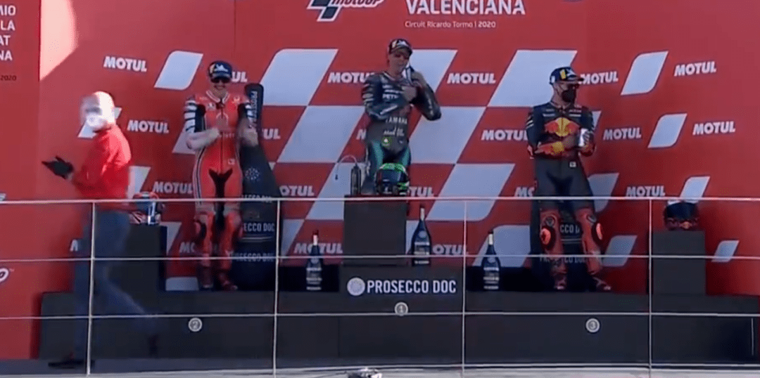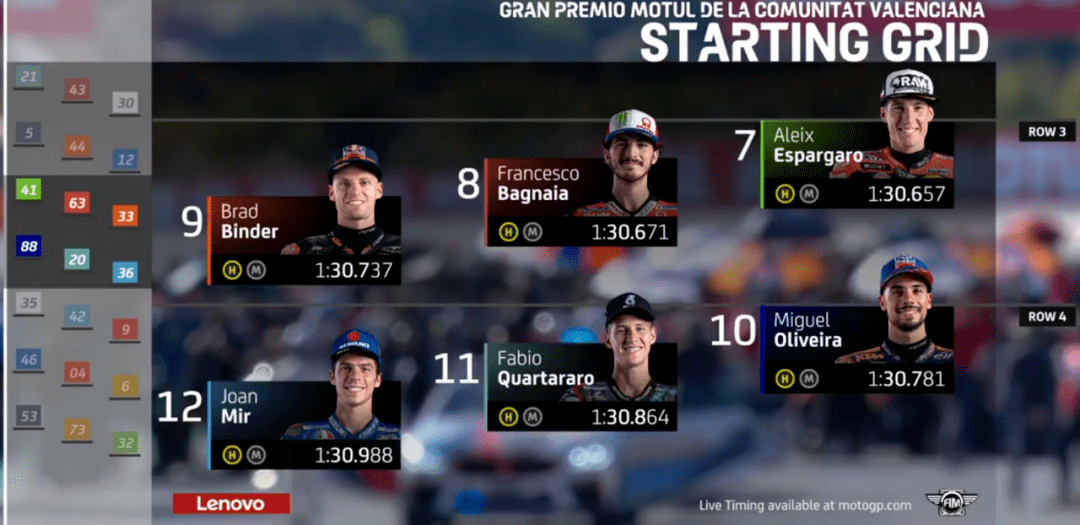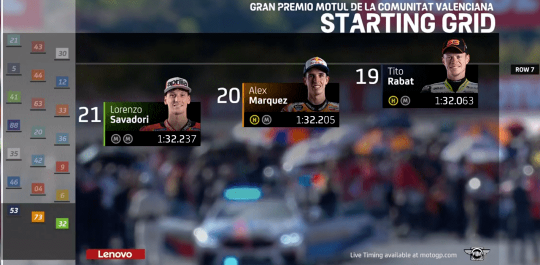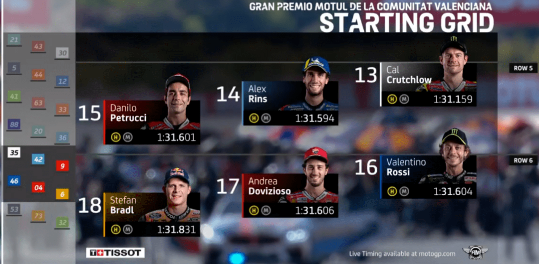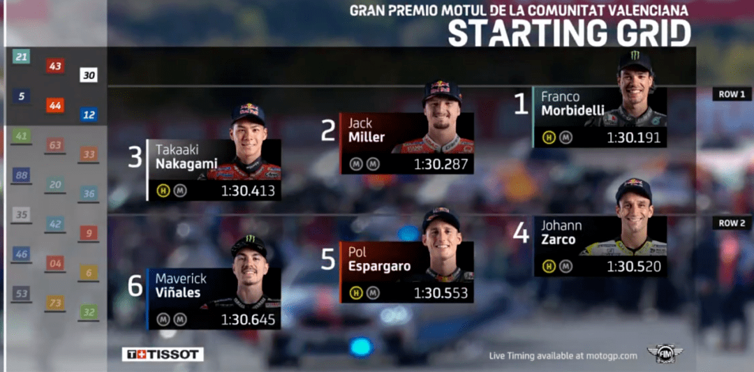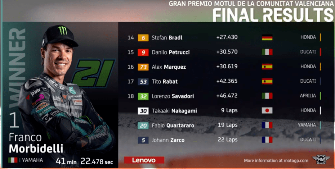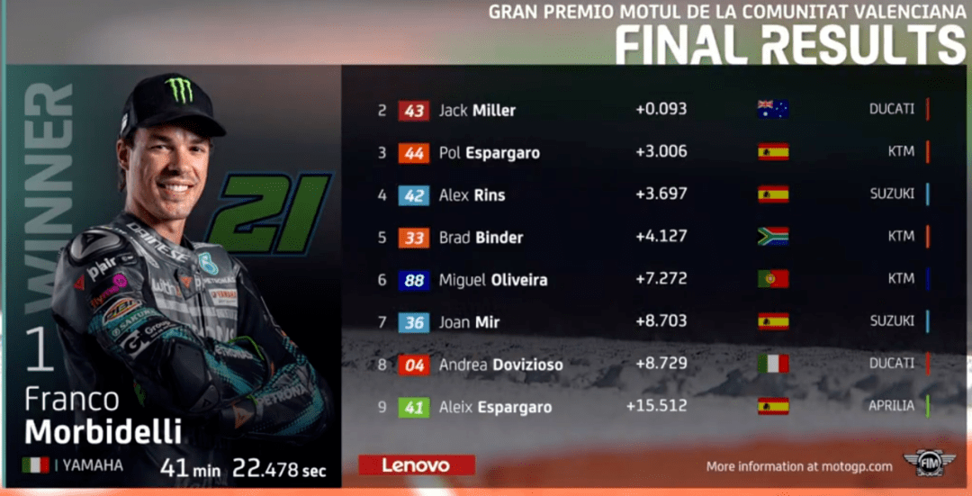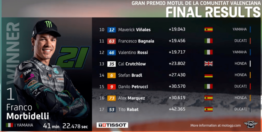 MotoGP來到倒數(shù)第2場,依舊是在瓦倫西亞。賽前,雅馬哈正式宣布簽下Cal作為下賽季的測試車手,這也預(yù)示著雅馬哈正式放棄了洛倫佐,而尤尼也被宣判禁賽4年,禁藥風(fēng)波正式結(jié)束,尤尼的職業(yè)生涯也就到此結(jié)束了,終于可以全身心投入到模特行業(yè)了。羅西賽前核酸檢測又出現(xiàn)陽性,好在又檢查了一遍變成了陰性,虛驚一場。