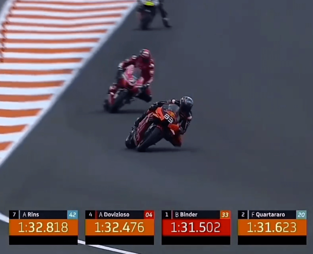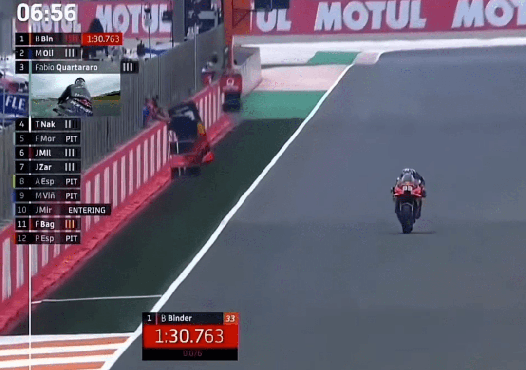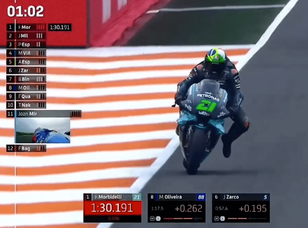 Q1的比賽大家都跑在了一起,看場面還以為是正賽,這種情況并不常見。上來Rins帶著小小馬、多維以及Tito一起跑,后面還跟著多位車手。車手們抱團(tuán)取暖并沒有換來好成績,反倒是后面的賓得跑到第1,緊接著賓得又刷新了自己的成績。此時在后面的小小馬直接來了個大highside,屁股著地重重摔在地上,好在問題不大,捂著屁股回去了。最終沒人超過賓得,賓得和小Q進(jìn)入Q2。