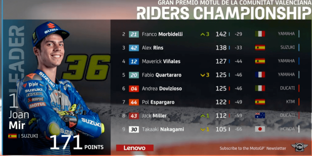 最終莫比如愿以償拿到第1,Jack第2,小E第3,Rins第4,Mir第7,多維第8,維尼第10,羅西第12,小小馬第16。Mir提前一站獲得年度冠軍,沒想到Mir在升上MotoGP的第二年就拿到GP組別生涯第1冠,這也是鈴木自2000年小肯尼·羅伯茨之后再次奪得年度冠軍,20年的等待,在不斷發(fā)掘新人的過程中,終于等到了冠軍,同時今年也是鈴木100周年,這個冠軍無疑是給鈴木最好的禮物。今年Mir只拿到過一次冠軍,積分只有171分,幾乎比往年冠軍積分了100分,真是神奇的一年,恭喜鈴木,恭喜Mir。