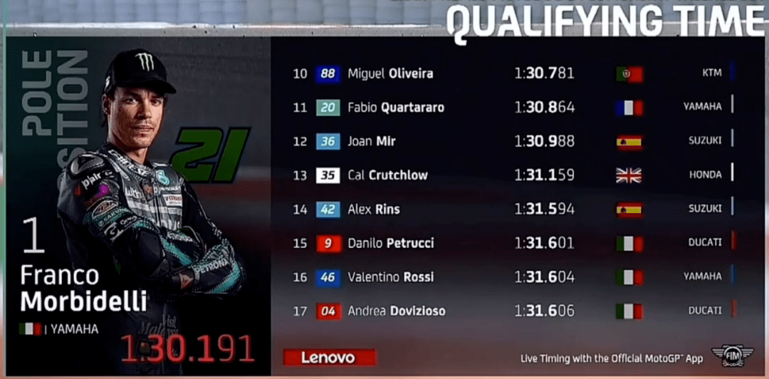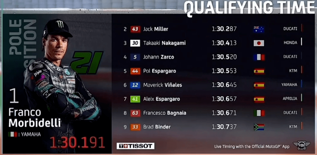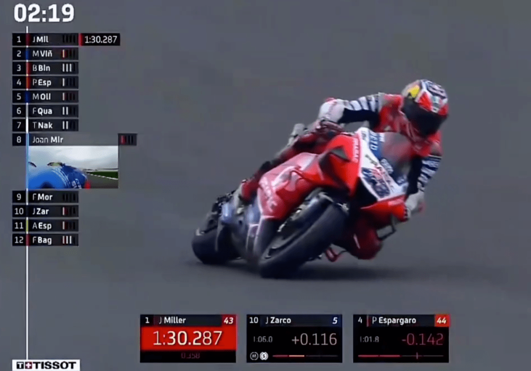 Q2比賽上來小Q跑出1:31.889拿下第1,結(jié)果奧利維拉跳出來跑出1:30.889擠下小Q,而緊接著賓得延續(xù)了Q1的好狀態(tài),1:30.763上到第1,兩臺KTM占領(lǐng)頭兩名。此時雅馬哈人開始發(fā)力,維尼1:30.645本以為穩(wěn)了,結(jié)果Jack突然殺出來,1:30.287大幅提升了桿位成績,Jack也以為這回穩(wěn)了,沒曾想莫比戴利1:30,191最后時刻帶走桿位。最終莫比第1,Jack第2,中上第3,維尼第6,小Q第11,Mir第12,Rins第14,多維第17,小小馬第20。爭冠三人組Mir、Rins和小Q狀態(tài)都不太好。
