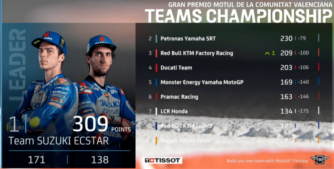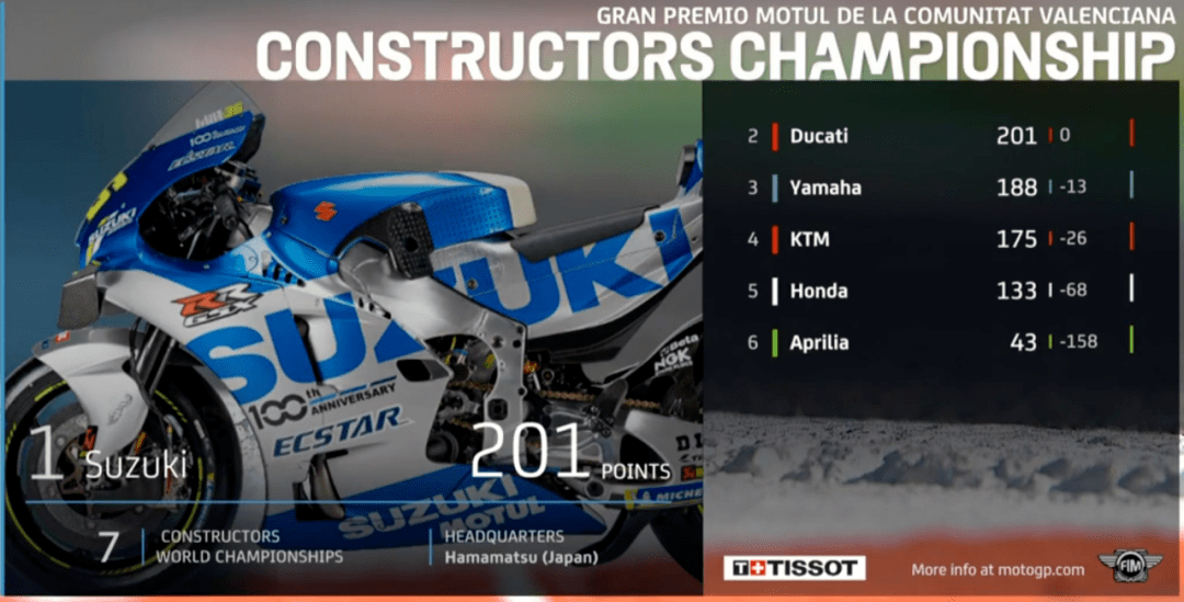 雖然年度冠軍已經(jīng)產(chǎn)生,但比賽還沒有結(jié)束,下一站將是全新的葡萄牙站,制造商積分榜上,鈴木也與杜卡迪平分,下一站能否拿下更多積分拿到制造商積分榜冠軍,完成大滿貫也是一大看點(diǎn),同時今年本田還沒拿過冠軍,并且KTM上臺的次數(shù)都比本田多,所以看本田能否在最后一戰(zhàn)拿到冠軍,結(jié)束尷尬的連續(xù)無冠紀(jì)錄……期待年終最后一戰(zhàn)。