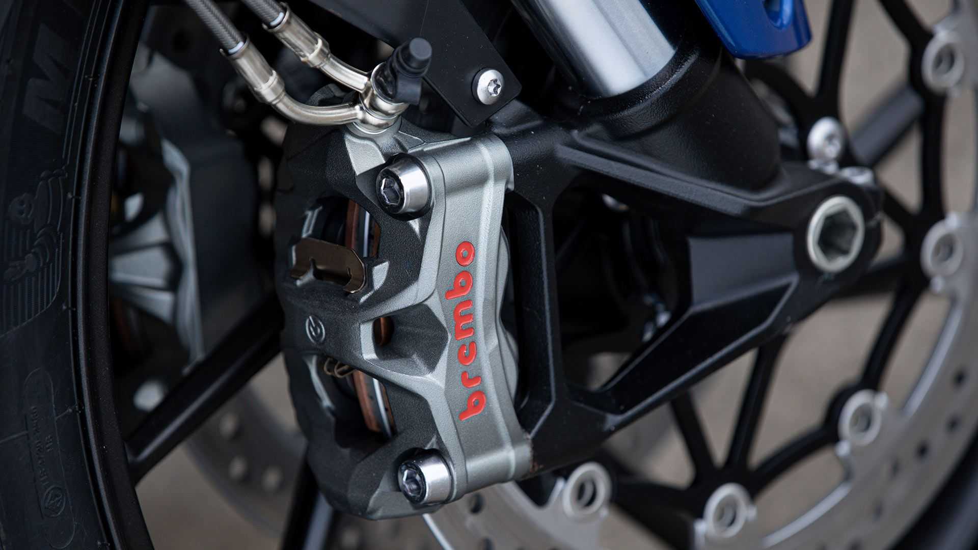 底盤方面,配備有45毫米的Marzocchi倒立式前叉,180mm行程;預(yù)載可調(diào)式Marzocchi中置后避震,170mm行程。19英寸鑄造合金前輪,Brembo Stylema四活塞卡鉗,和一對320mm制動盤,而17英寸后輪則裝有一個單活塞Brembo卡鉗,和255mm單制動盤。輪胎由Michelin Anakee Adventure提供,另有雙通道ABS防抱死系統(tǒng)。