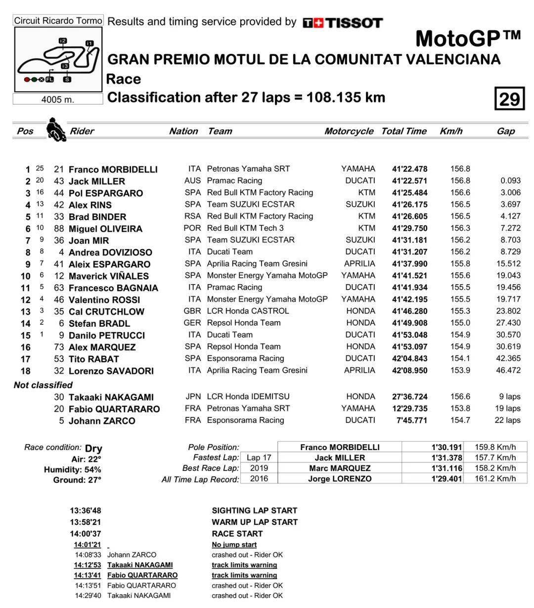 積分榜上的兩位主要挑戰(zhàn)者林斯(他獲得了本站比賽的第四)、夸塔拉羅都沒能在本站比賽中獲得前三名,穩(wěn)扎穩(wěn)打地在這站比賽中拿到了第七名的米爾,獲得了足夠積分(171 分,比排在第二名的 142 分、多出了超過 25 分)、提前一站奪得了 2020 賽季 MotoGP 級(jí)別的年度總冠軍。