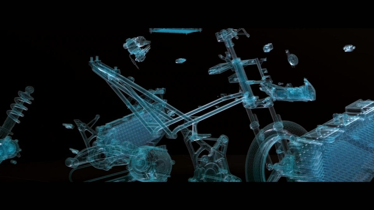 視頻當(dāng)中的結(jié)構(gòu)透視圖,能夠看到車架其實(shí)十分接近跨騎車型,還配備了正立式前叉和單式后避震。