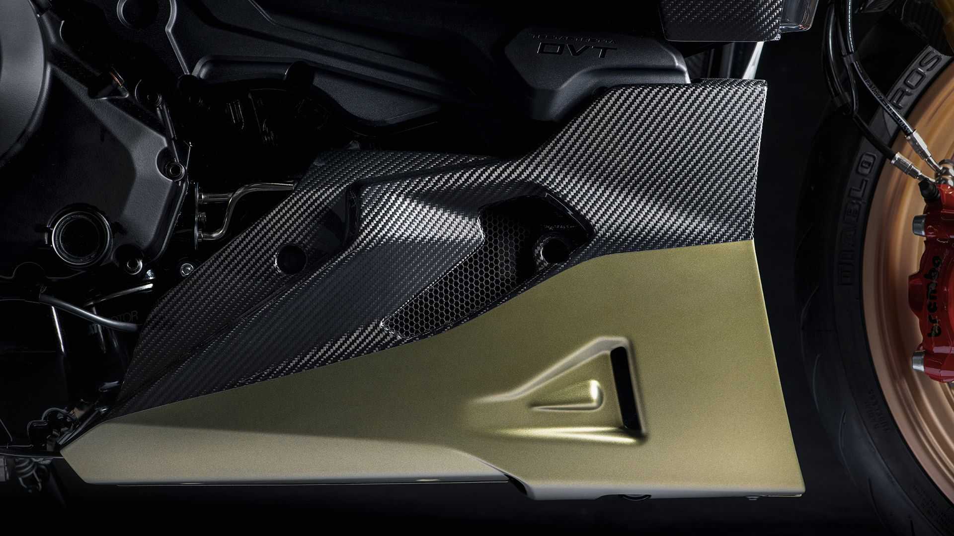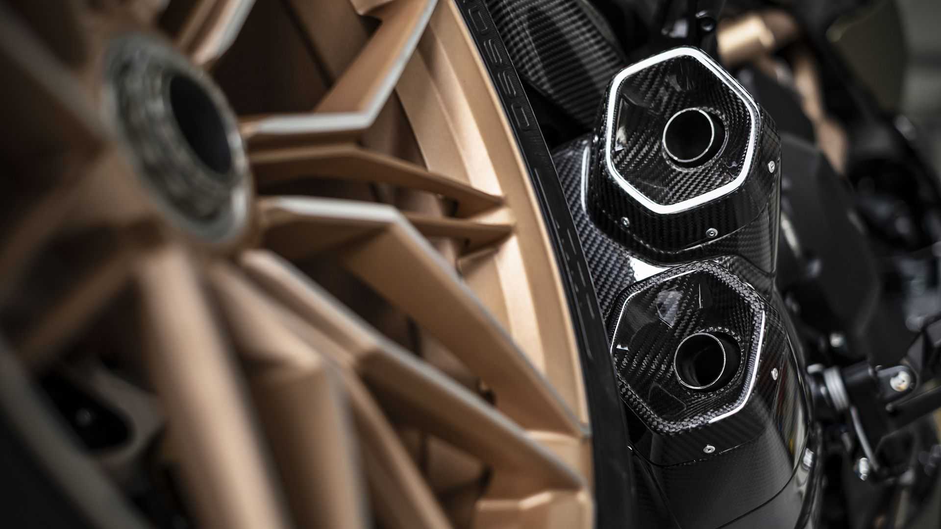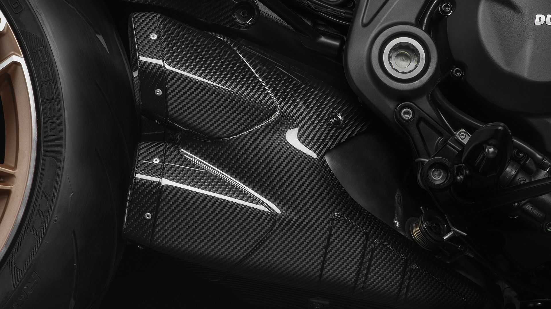 杜卡迪還為蘭博基尼版的散熱器蓋,進(jìn)氣口,排氣蓋,擾流板,中央油箱蓋,座椅套,擋泥板,儀表罩和前燈架添加了碳纖,。輕巧的材料有助于減少整備重量,與Diavel 1260 S相比減少了約1kg左右。