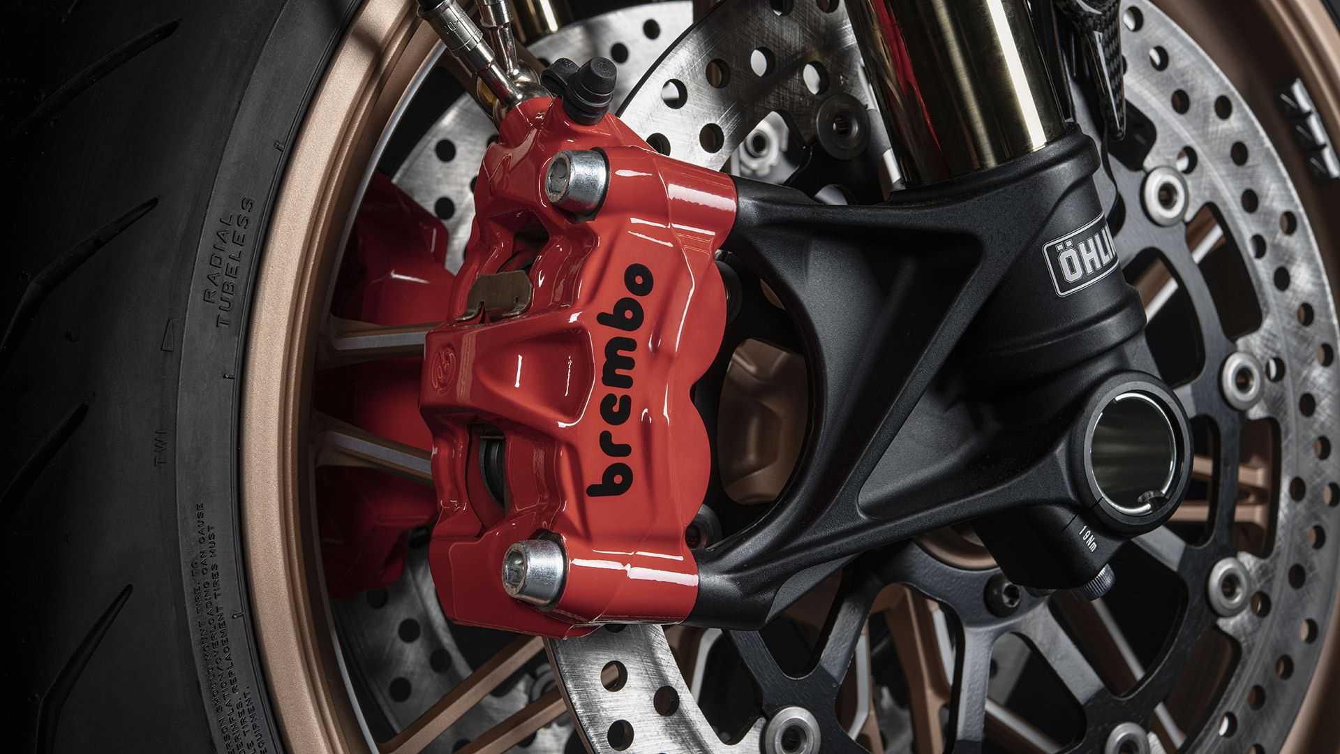 懸架系統(tǒng)與Diavel 1260 S相同,包括一個(gè)完全可調(diào)的48毫米倒叉和Öhlins的后部單震。除了紅色外,徑向安裝的Brembo整體式M50四活塞卡鉗還與S型號(hào)相同。