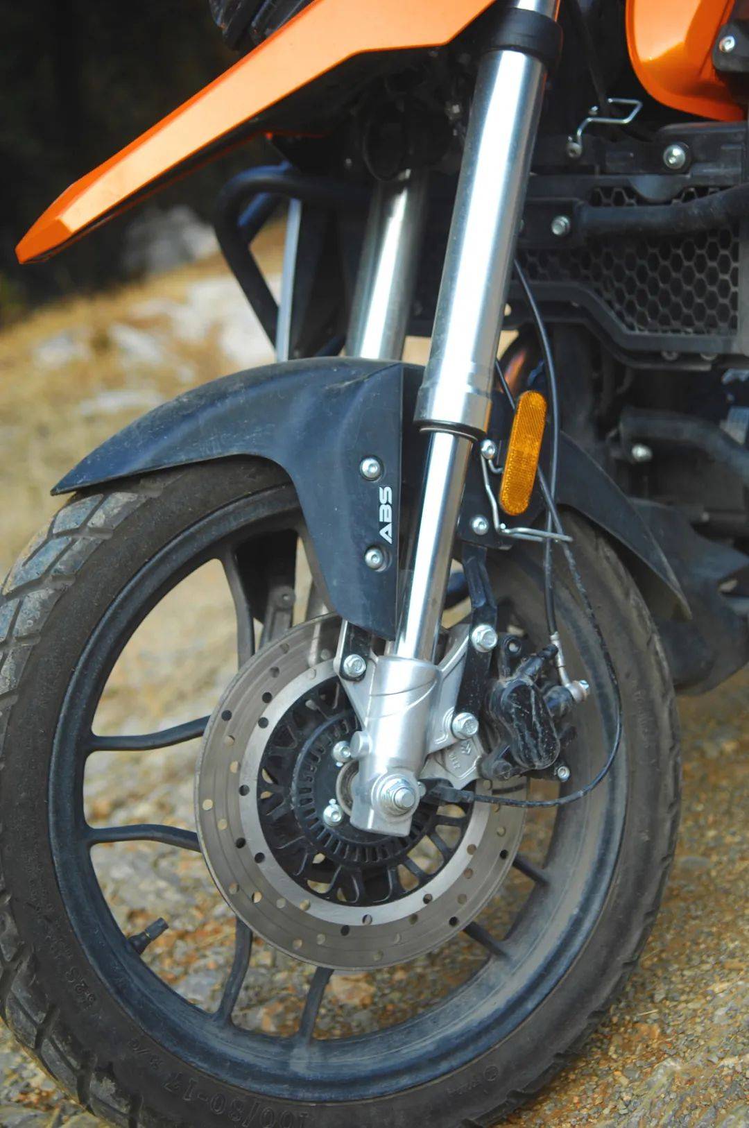 在懸掛的表現(xiàn)上,劉立建的評價是:非鋪裝地帶,及格;鋪裝路面,優(yōu)秀。先說非鋪裝地帶。其實此車的前后懸掛規(guī)格都是不低的,倒置式前懸掛的行程足有190mm ,后懸掛為緩沖性能更佳的多連桿連接,但偏舒適的“軟”調(diào)校再壓上車手重量和行李,在顛簸中會大幅增加車體的下沉幅度,想騎得從容些就只能放慢速度小心通過了,否則很容易讓發(fā)動機(jī)護(hù)板與地面的凸起處碰擦。當(dāng)然,此車的強(qiáng)項正是復(fù)雜地帶的通過能力,它慢一點就能通過的地段,一般離地間隙低的車型只怕就要下車推行了。劉立建說,在鋪裝路面甚至較平整的砂石路段,前后懸掛給人的感受只有舒適了,配得上“優(yōu)秀”二字。