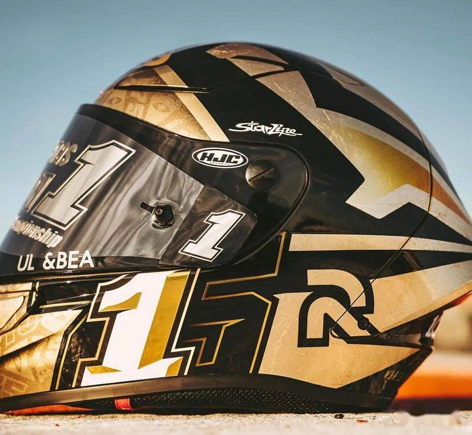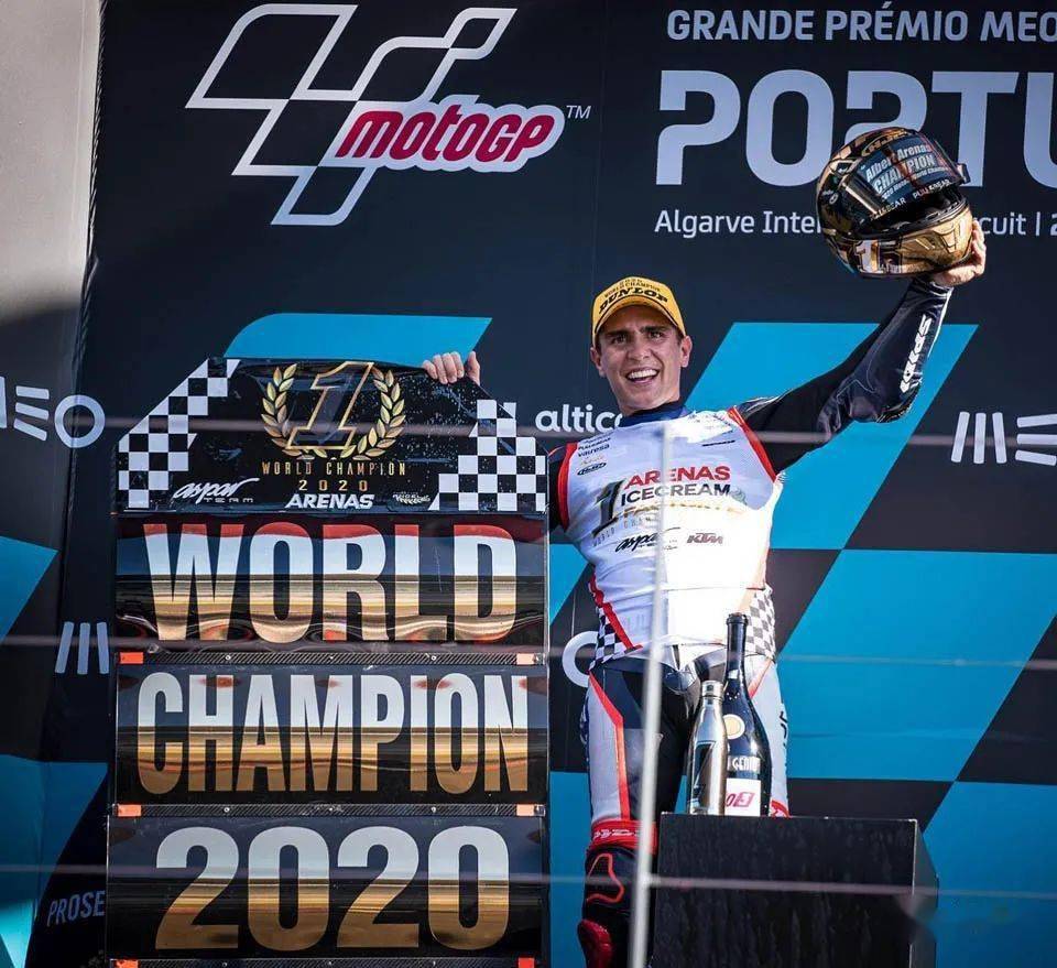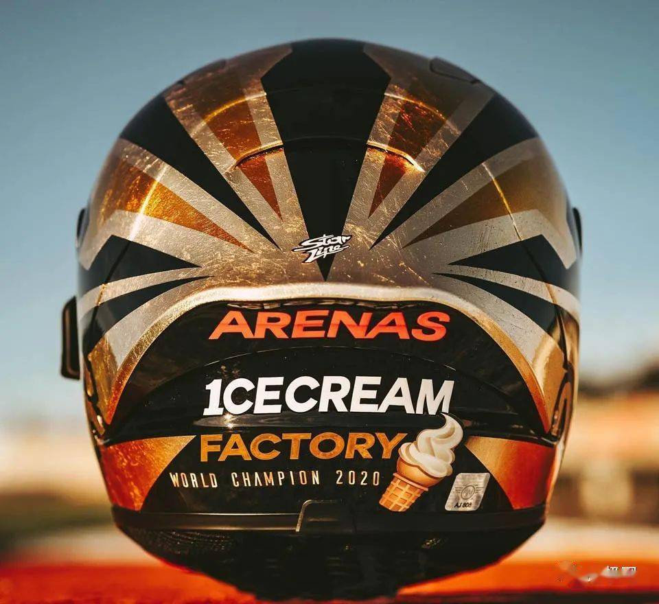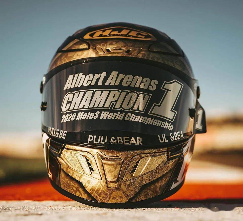 來到2020年,Albert Arenas有突飛猛進的表現(xiàn),于2020年MOTO3 15場賽事中,取得總積分174分,力壓同樣170總分的Tony ARBOLINO及Ai OGURA兩名車手,成功奪得2020 MOTO3世界冠軍的寶座。為慶祝Albert Arenas車手奪2020 MOTO3世界冠軍殊榮,作為他的頭盔廠HJC特別制造一頂全新拉花的金盔加冕,在賽道上行勝利的巡游,分享奪冠的喜悅。