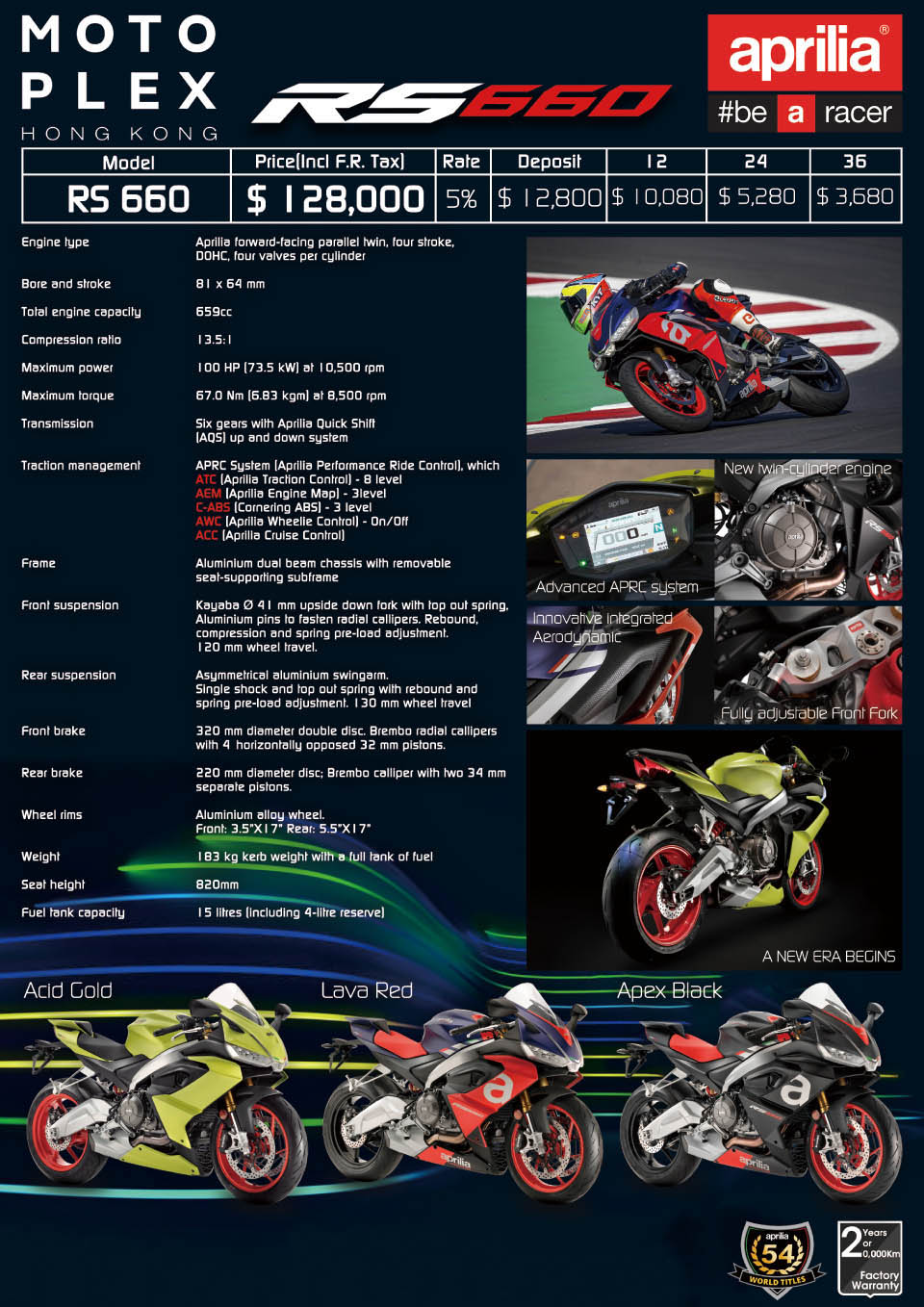 最近,阿普利亞中量級性能仿賽RS660,香港的售價被公布,加上登記稅之后的價格為12.8萬港幣,折合人民幣大概10.8萬的樣子,減去登記稅的價格12.16萬港幣,約合10.3萬人民幣左右。香港的價格對最終國內的售價具有很大的參考價值,最終的國內的價格也會與之相差不大。