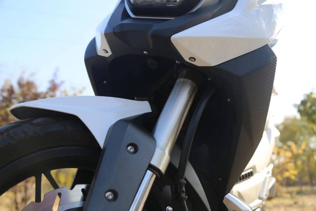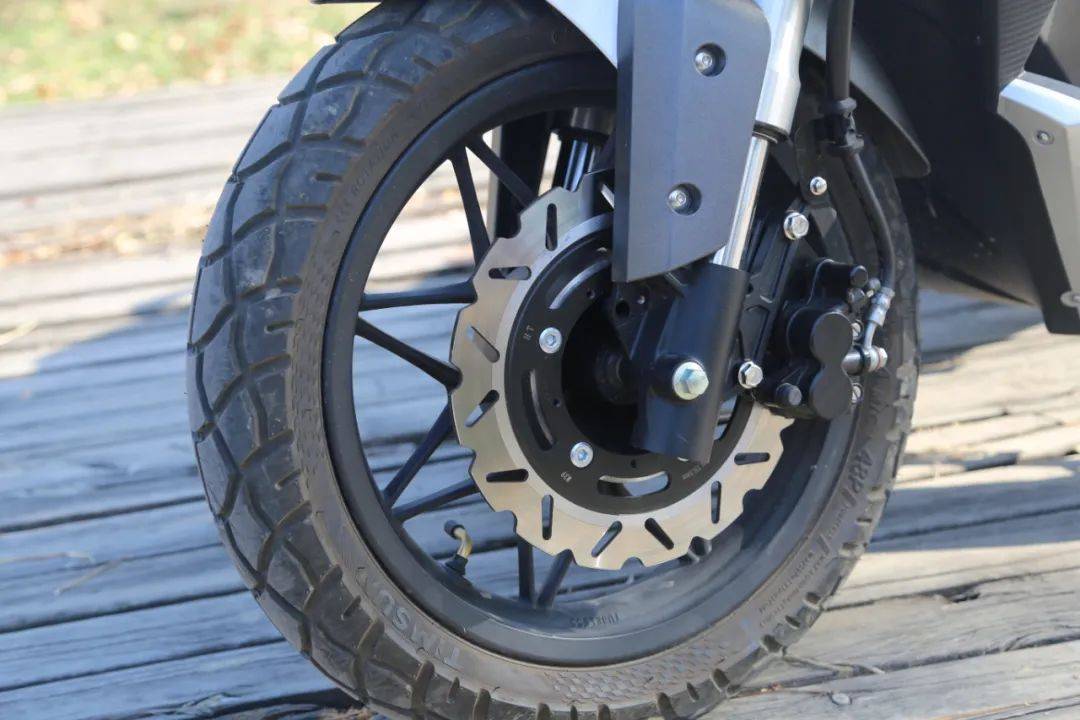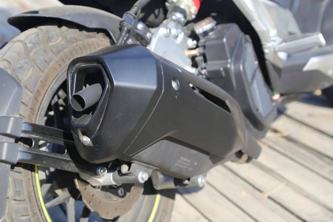 既然KPV150是跨界踏板彰顯ADV屬性那么配置非常規(guī)的懸掛行走系就是必然的。KPV150采用大直徑倒置式前避震器,多段預(yù)載可調(diào)的側(cè)置式單后避震器,搭配前后14寸寬體多用途騰森輪胎(前100/80-14,后120/70-14)。因此,KPV150擁有較高的離地間隙和較好的通過(guò)性能。但由于車身架構(gòu)以及傳動(dòng)體系和常規(guī)踏板摩托車未做本質(zhì)性革新,所以導(dǎo)致KPV150的最大離地間隙還是與跨騎摩托差距較大,這也多少限制了其ADV屬性的發(fā)揮。但力帆KPV150還是能從容應(yīng)對(duì)常規(guī)摩旅路況和輕非鋪裝路況(本文后段詳述)。離地間隙稍顯不足其實(shí)并不是KPV150行走系統(tǒng)的缺點(diǎn),因?yàn)槲蚁嘈艣](méi)有人真的拿它去沙漠、戈壁當(dāng)個(gè)越野摩托來(lái)霍霍。目前KPV150的減震風(fēng)格更適合于運(yùn)動(dòng)(鋪裝路面跑山)和代步。優(yōu)點(diǎn)也較為明顯,KPV150軸距相對(duì)較短操控靈活,對(duì)于車輛舵角和傾角有非常好的操控指向性。力帆KPV150是用心的!