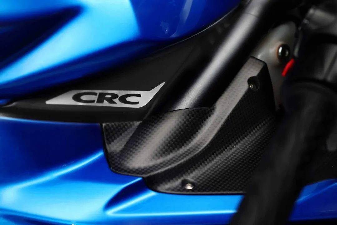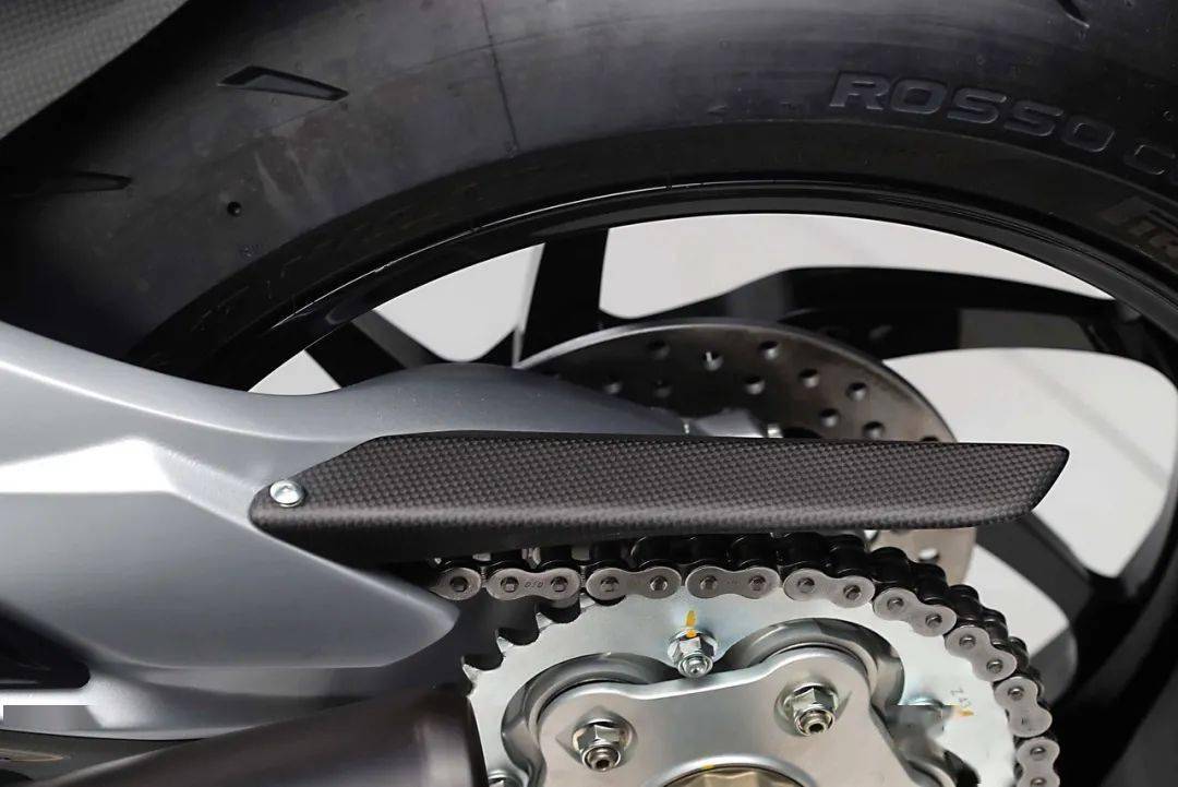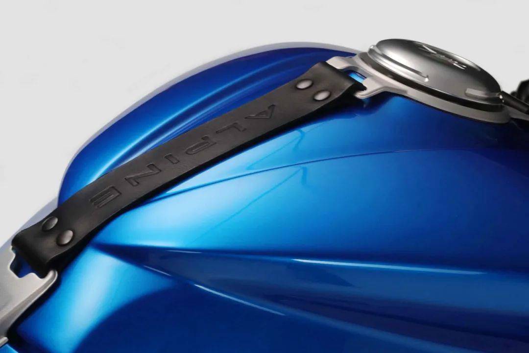與標準款的 Superveloce 800 相比,Alpine 版采用了更多以碳纖維復合材料制作而成的組件(鏈條護板、風道蓋、前后擋泥板以及整流罩的下部),一個獨特的藍/灰色車體圖案,復古風格的油箱蓋飾件,藍色縫線的鞍座,多處的 CNC 加工而成的組件等,而車頭的上三星(上前叉三角臺)有限量生產(chǎn) 110 臺的標記。