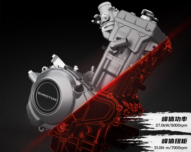 QJMOTOR追350的這臺發(fā)動機,是在龍三的發(fā)動機上擴缸升級而來,實際排量353cc的同步雙缸發(fā)動機,最大功率27kw/9000rpm,最大扭矩31Nm/7000rpm,百公里加速6.1秒。